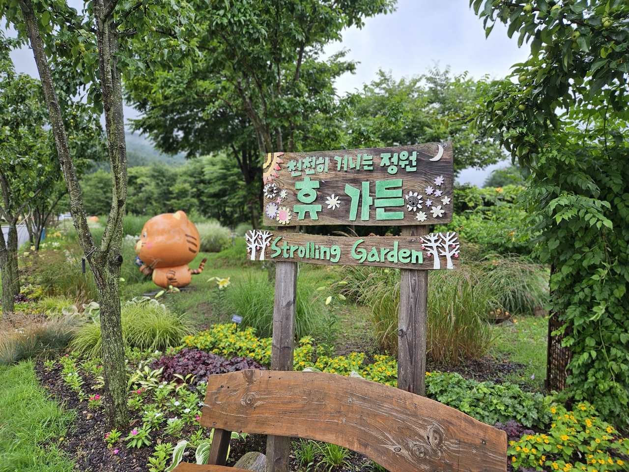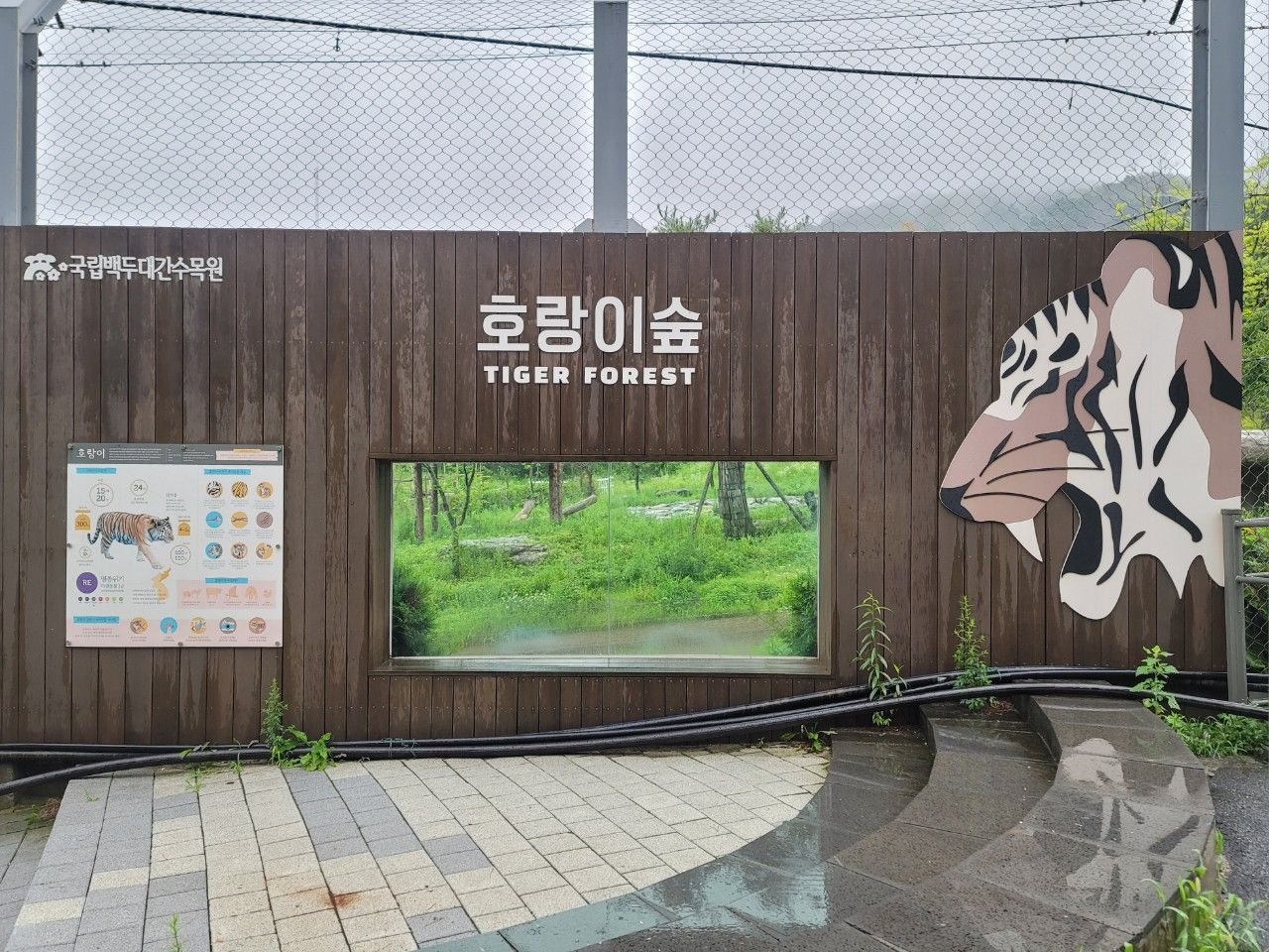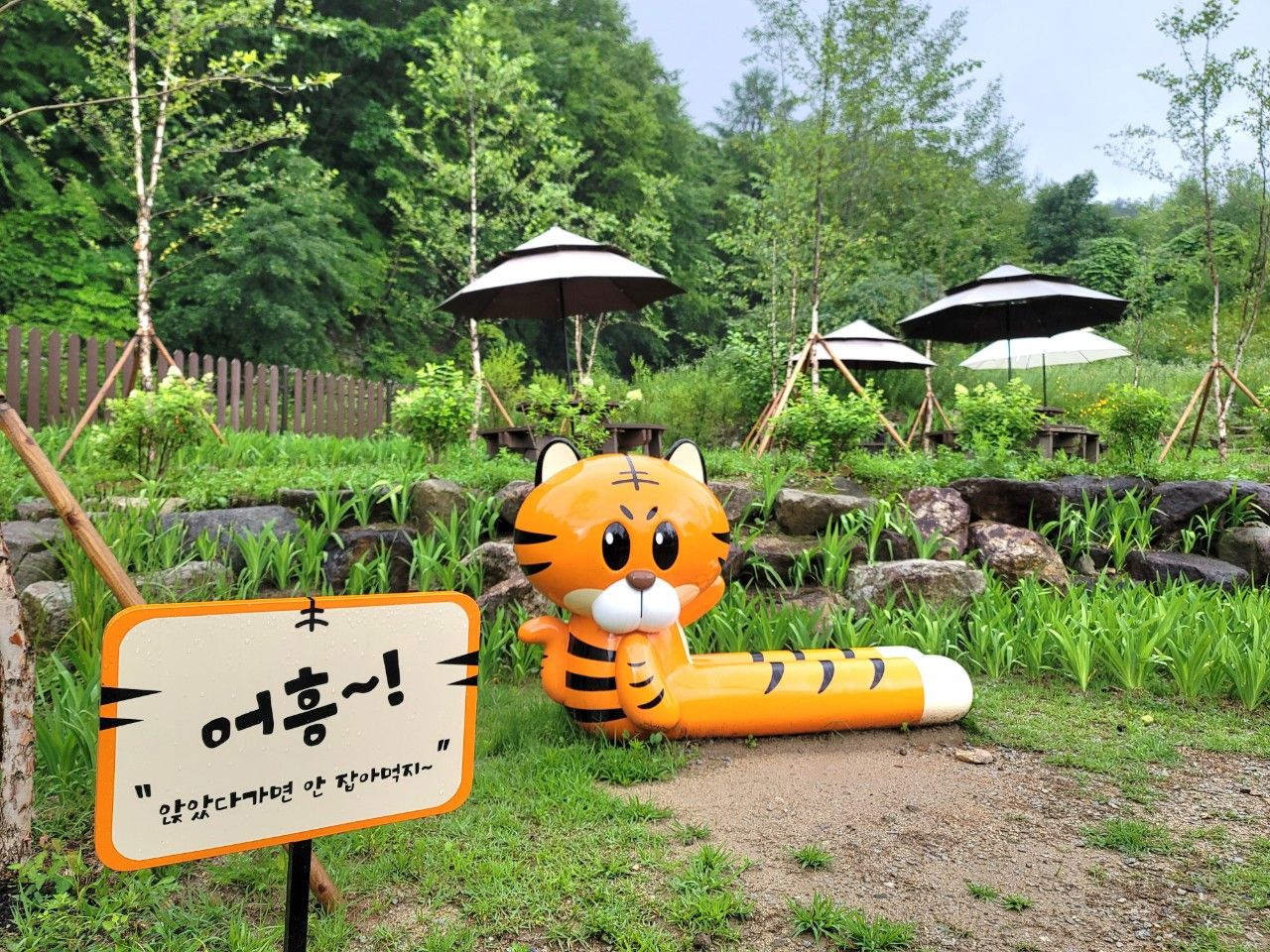 호랑이숲으로 가는 길에 앉았다 가라는 비율 좋은 호랑이도 만났습니다. 빗물만 아니면 앉았다 갈 텐데 말이죠~~^^