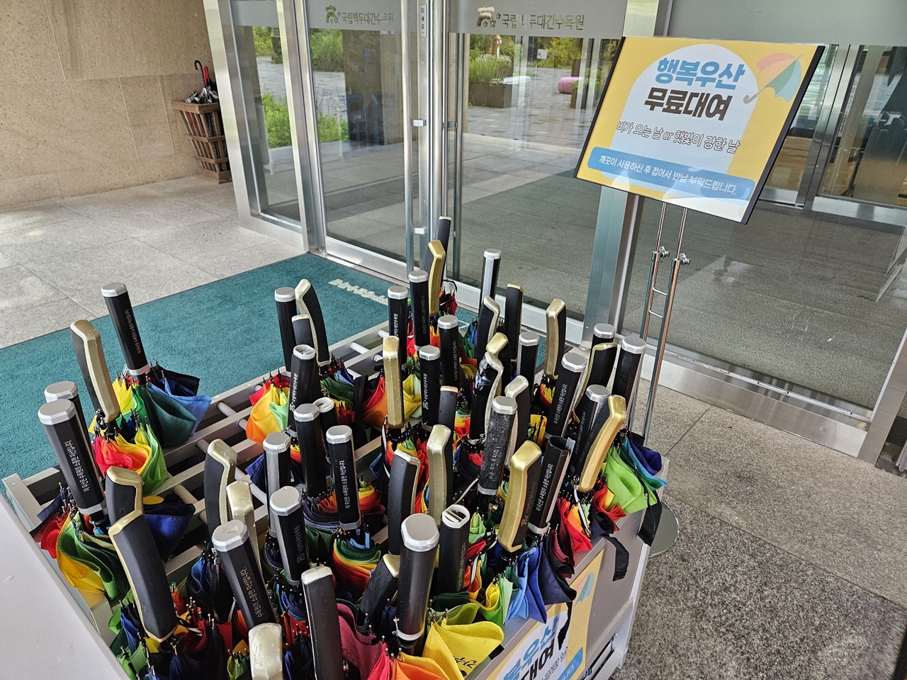 밖으로 나가니 알록달록한 우산을 대여해 주고 있었는데요~ 비가 많이 내려 우산 하나 무료대여했답니다.