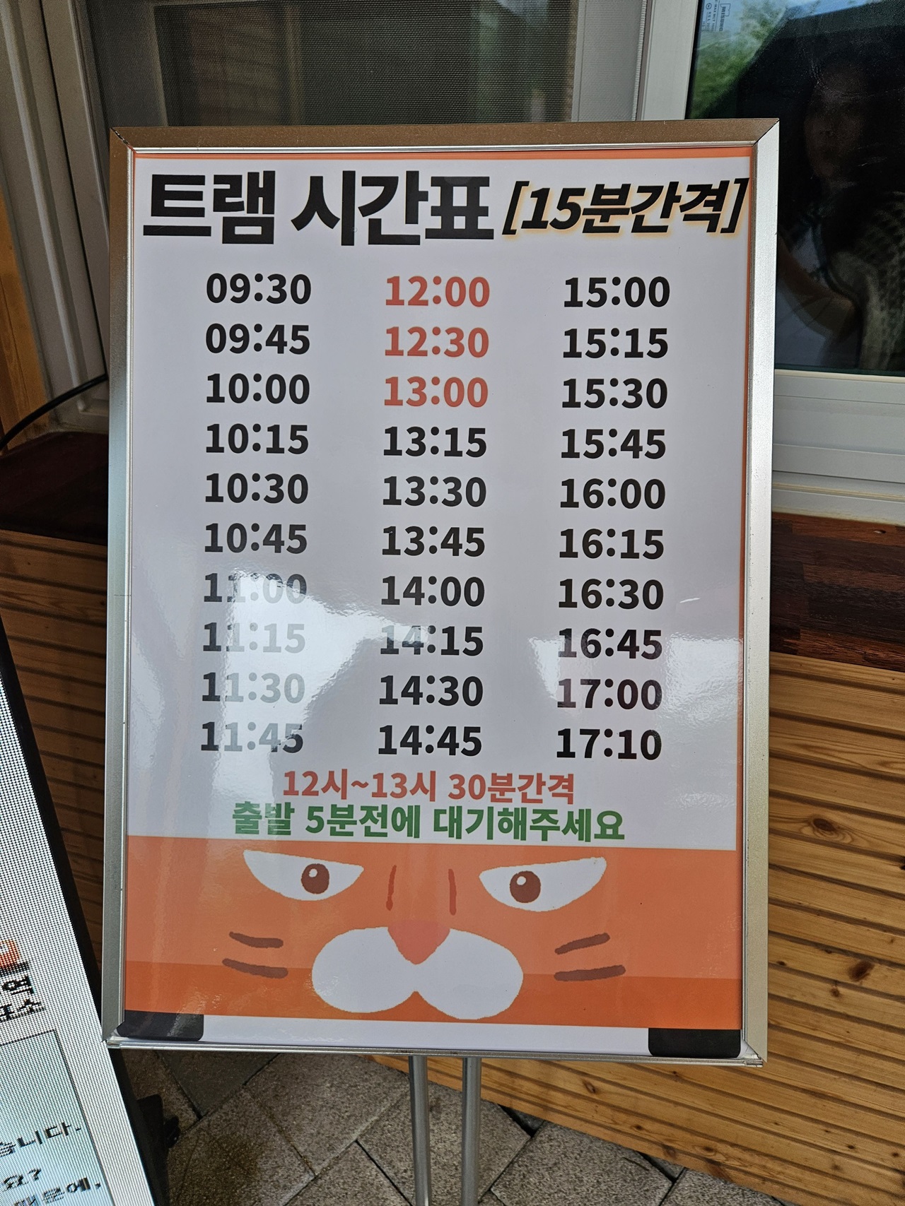 트램 탑승안내와 시간표 참고하세요~ 9시 30분부터 17시 10분까지 15분 간격으로 운행하고 점심시간에는 30분 간격이네요~