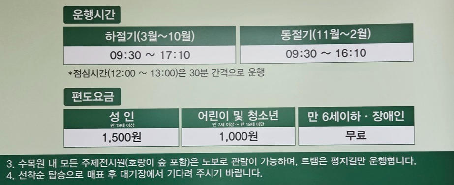 운행시간이 하절기보다 동절기는 1시간 짧네요~ 편도요금은 성인 1,500원, 어린이 및 청소년은 1,000원입니다.