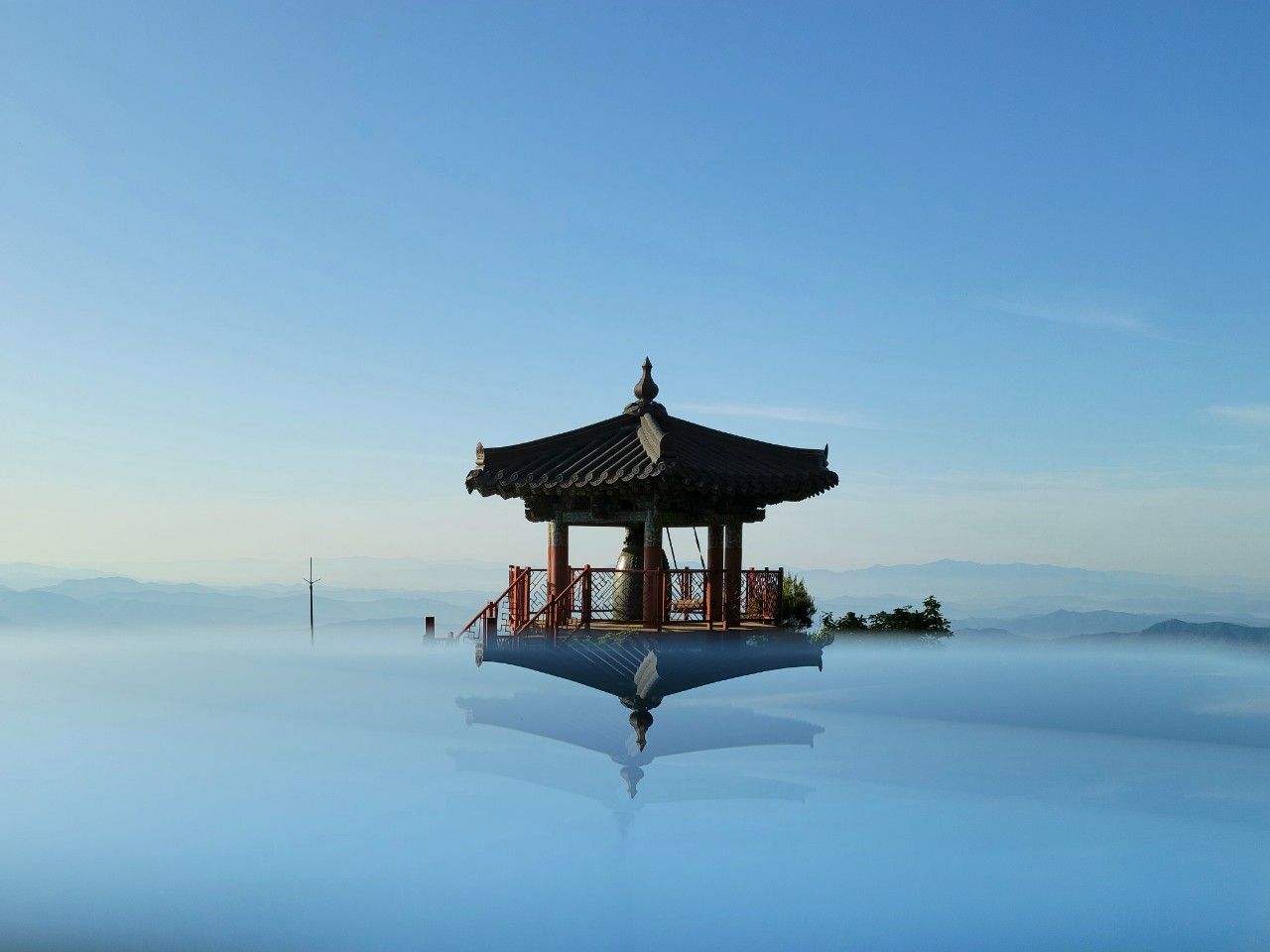 거울에 비친 약사암 종각입니다. 마치 무릉도원과도 같아 보입니다. CG 절대 아닌 거울과 물로 만든 작품입니다.