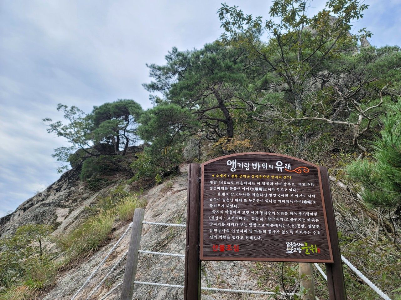 앵기랑바위는 보는 방향에 따라 애기 동자승 모습을 하고 있다고 해 붙여진 이름이라고 합니다. 군위군 양지리 마을을 내려다보고 있어 마을의 흉사가 없도록 지켜주는 수호신 역할을 했다고 전해집니다.