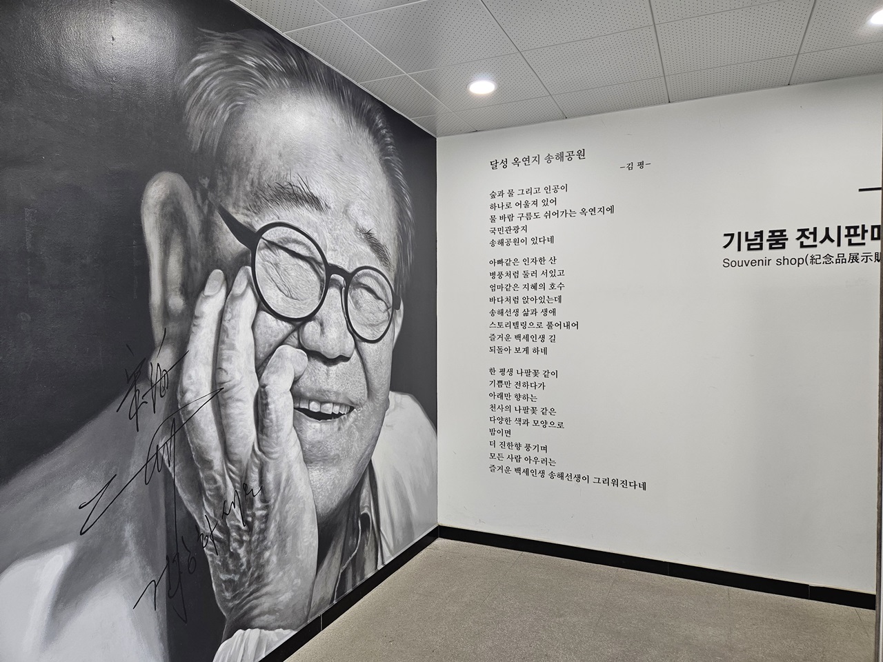 옥연지 일대에 자리 잡고 있는 송해공원은 달성군 명예군민인 송해 선생의 이름을 따 만든 곳입니다. 둘레길 데크, 백년다리, 바람개비 쉼터, 전망대, 금동굴 등 다양한 볼거리로 조성되어 있습니다.