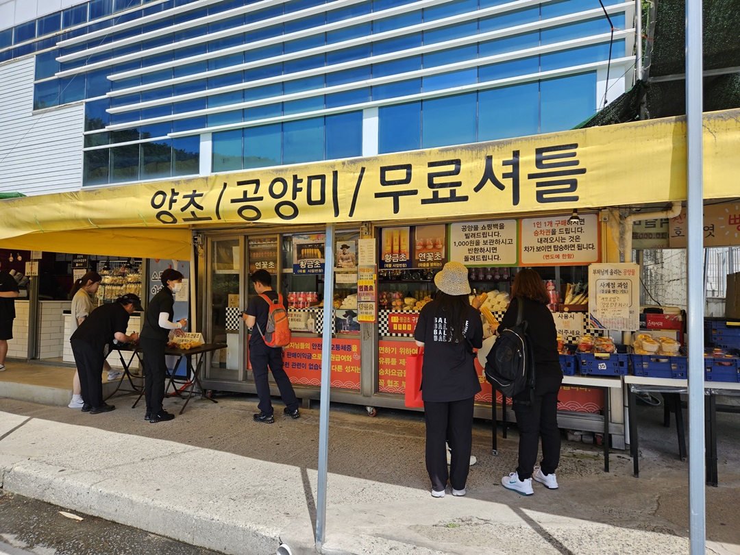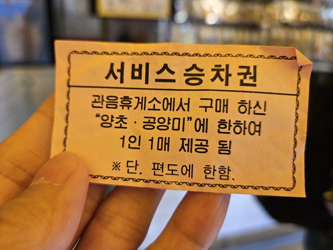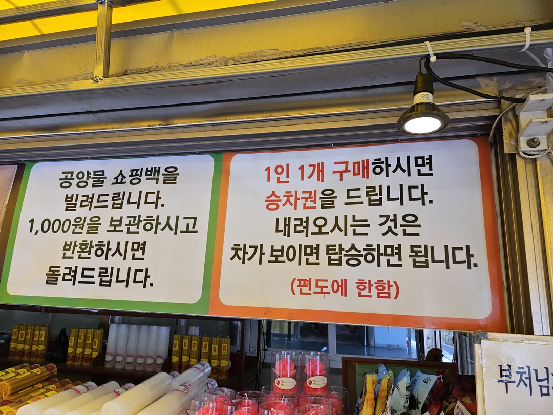 관음주차장에 주차를 하면 공양에 사용할 초와 음식, 쌀 등을 구입할 수 있는 가게과 카페도 있는데요. 어떤 것이든 하나 구입하면 팔공산 갓바위 입구까지 가는 셔틀버스 차표를 한 장 받을 수 있답니다.