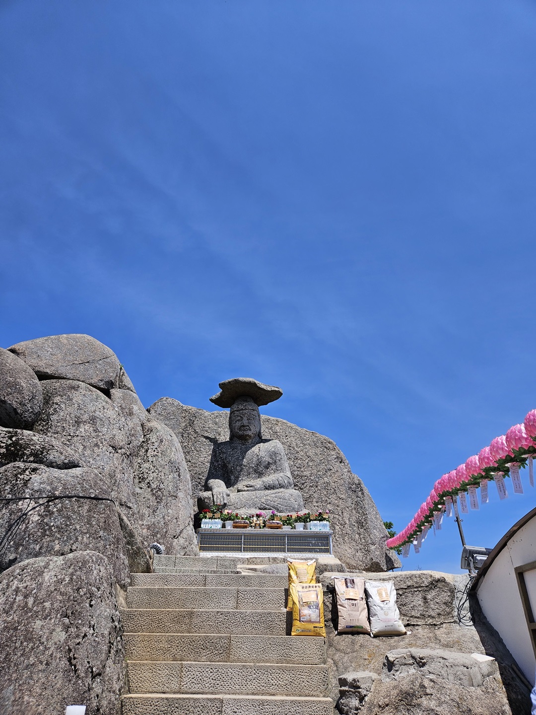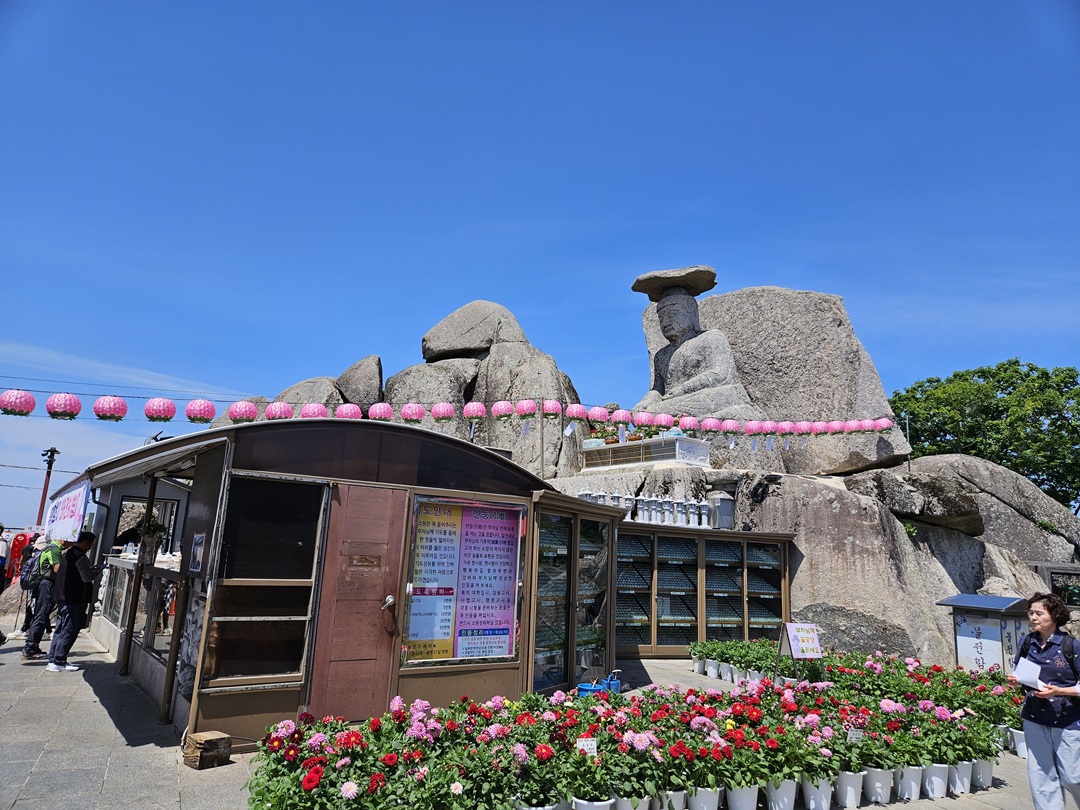 갓바위 도착했습니다. 날도 맑고 아주 좋은 날인데요. 옆으로 봉양 꽃화분도 많이 놓여있었어요. 갓바위가 잘 보이지 않게 바로 앞에도 봉양품을 판매하는 곳이 있어서..... 조금은 아쉬운 마음이 들었답니다.