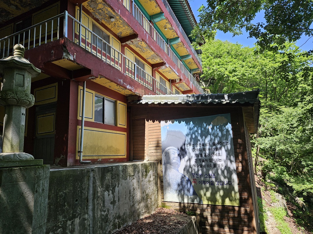 오른쪽으로 보이는 건물이 공양간이라고 하더라구요~ 많이 낡아 보인다고 생각했는데 가까이 가보니 공사 중이라는 문구가 있었습니다.