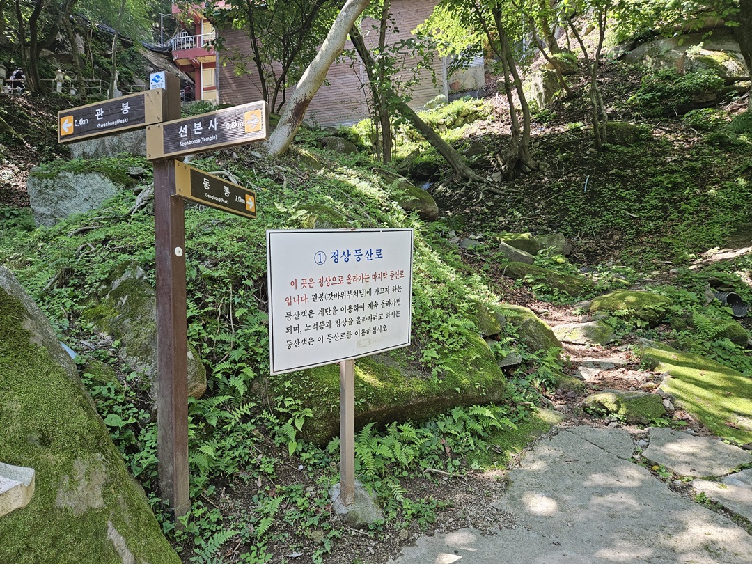 버스로 체감상 2~3분 정도 오른 것 같았는데요. 걸어서 이동하시면 15~20분 정도 소요된다고 하네요. 편하게 갓바위 가는 길 바로 입구까지 도착했습니다. 왼쪽으로 가면 갓바위, 오른쪽에 살짝 보이는 곳이 선본사입니다.