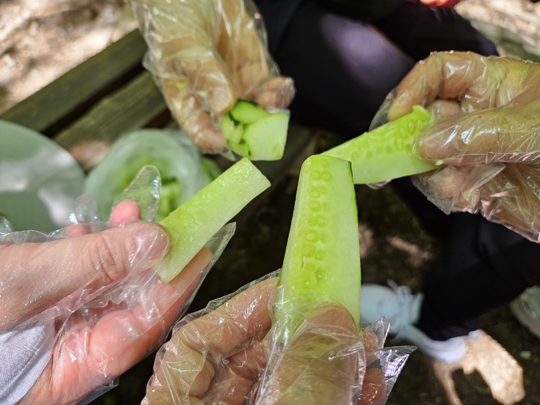 내려가는 길에 조금 쉬어가며 시원한 오이도 먹었는데요. 아침 일찍 일어나 정성스럽게 씻고 깎고 자르기까지 한 마음이 고마웠답니다.