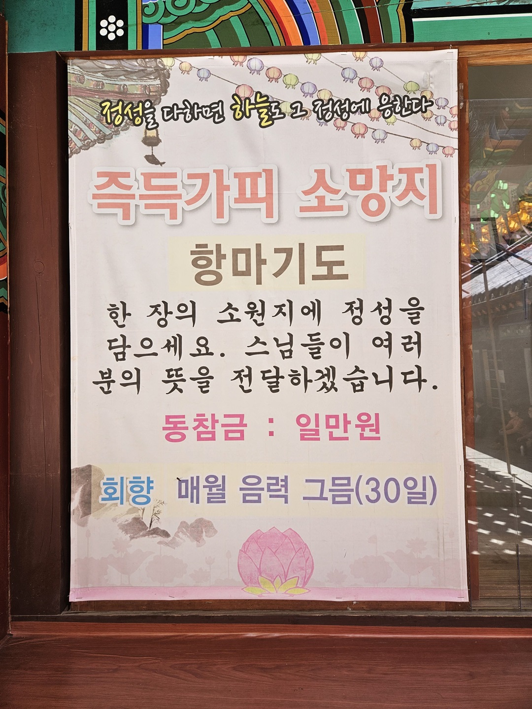소원지 기도 하나 접수했는데요. 다른 기도축원비는 계좌이체가 가능하지만 소원지 기도는 현금만 가능하다고 합니다.