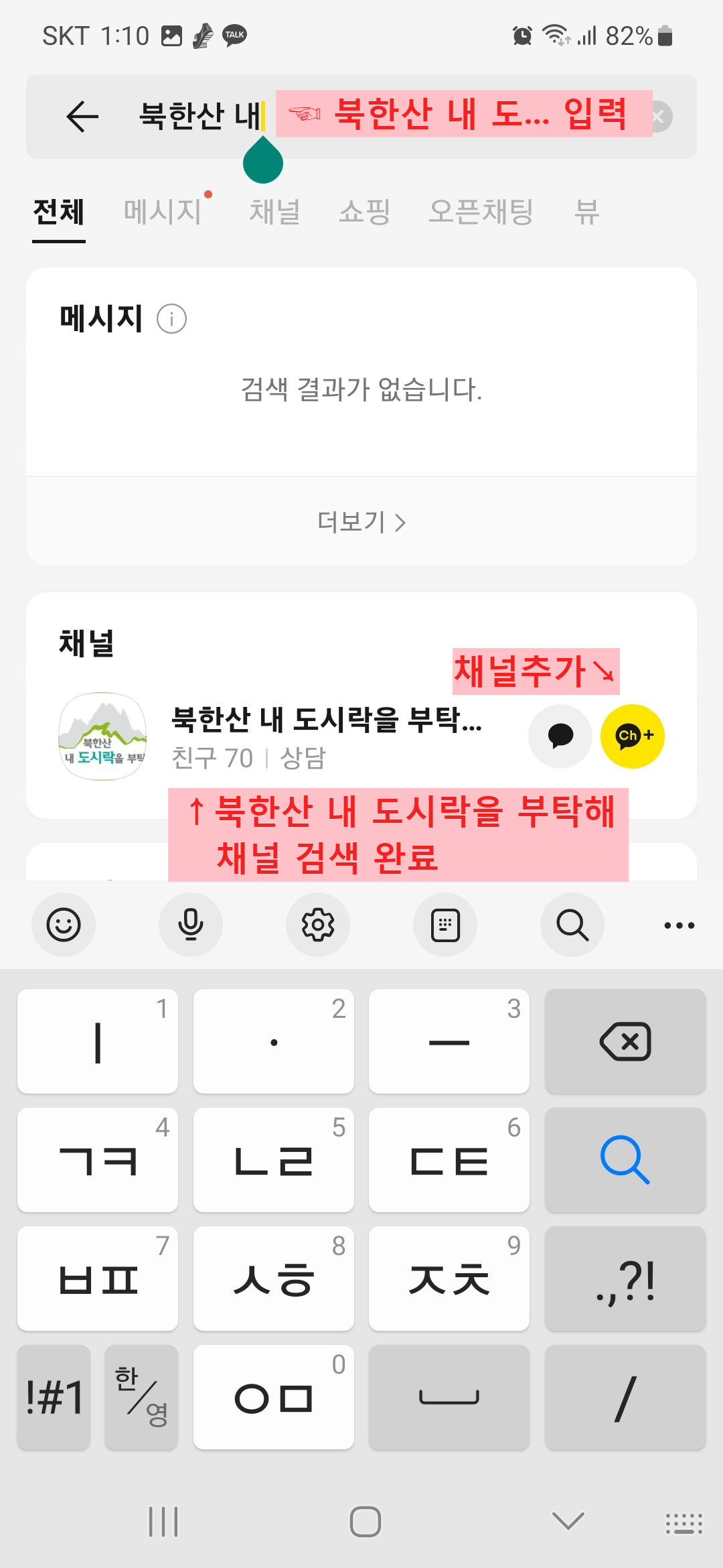 검색창에 '북한산 내 도시락을 부탁해'를 입력하면 아래 채널이 보입니다. 채널추가를 하고 주문하시면 됩니다. 북한산 내... 까지 입력하니 바로 검색이 완료됩니다.