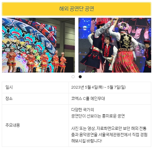 서울국제관광전은 세계 60여 개국이 참가하는 아주 큰 행사이고 다양한 관광과 여행, 문화를 느끼고 체험할 수 있는 좋은 기회입니다. 매일 다양한 공연을 관람할 수 있으며 맞춤형 여행상품도 특가로 구매하실 수 있으시니 놓치지 마시고 꼭 참여해 보시기 바랍니다.