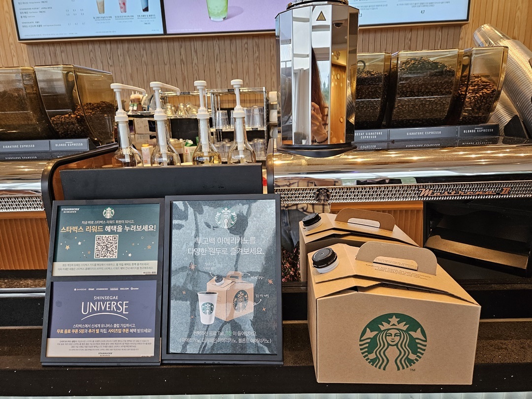 2층에서 내려다보니 이마트24 편의점과 스타벅스 다른 공간이 보였네요~이쪽에서 주문하고 음료를 가지고 가서 마실 수 있더라구요~