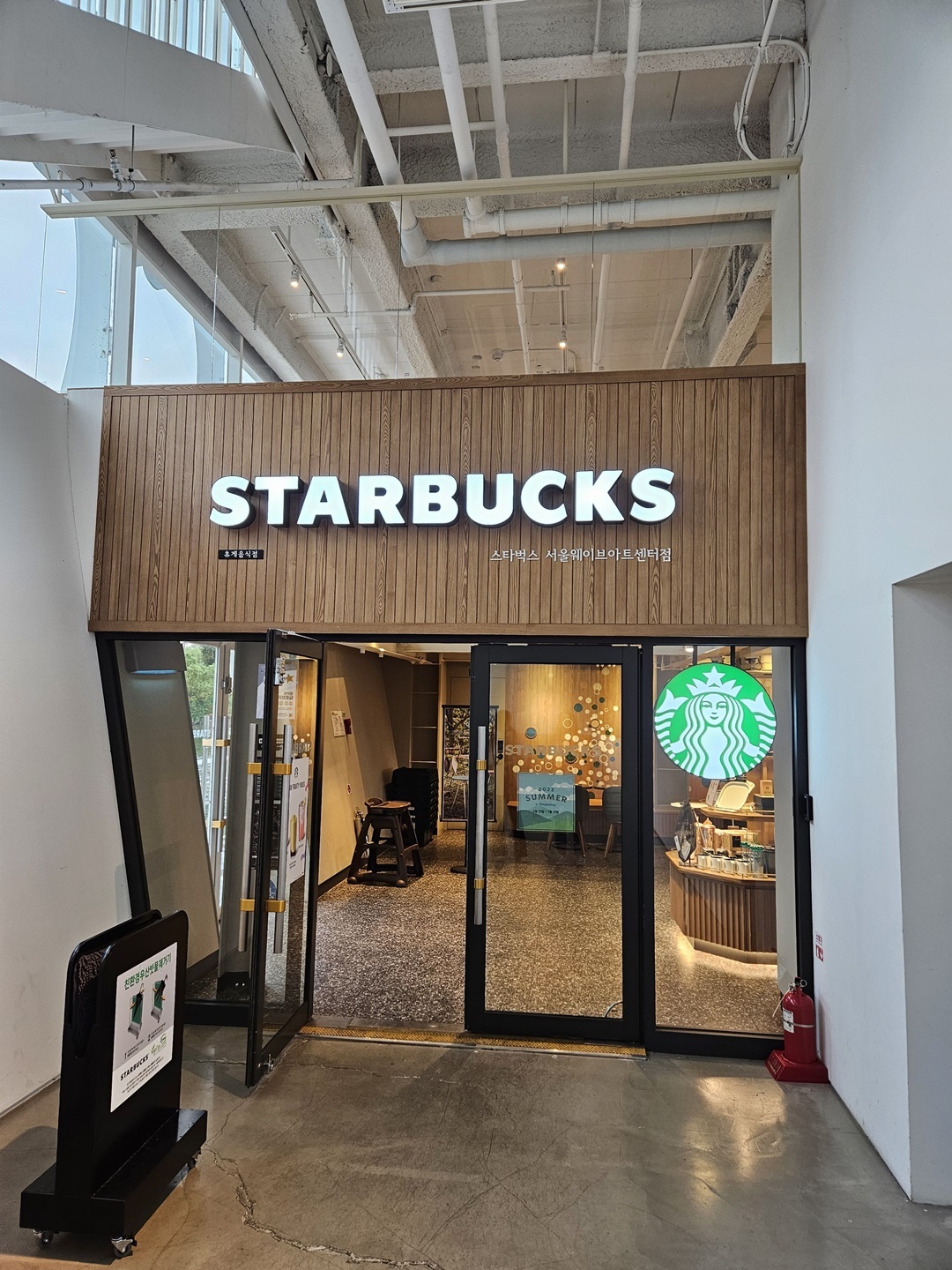 스타벅스 서울웨이브아트센터점 입구입니다. 비가 내리고 있어서 빗물제거기도 친환경으로 준비되어 있네요~ 비닐 사용을 하지 않을 수 있어서 좋았습니다.