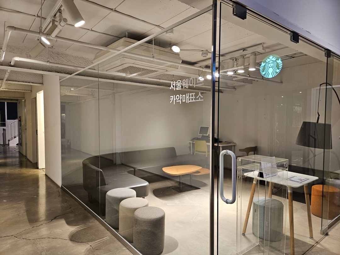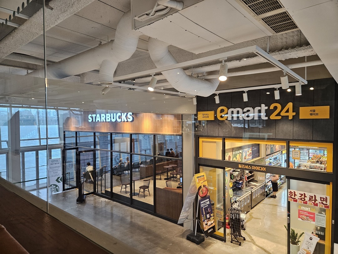 스타벅스와 이마트24 편의점이 있었고요~입구에서 좌측에 스타벅스 주문하는 곳이 있고 오른쪽에 이마트24와 스타벅스 차 마실 공간이 따로 준비되어 있습니다.