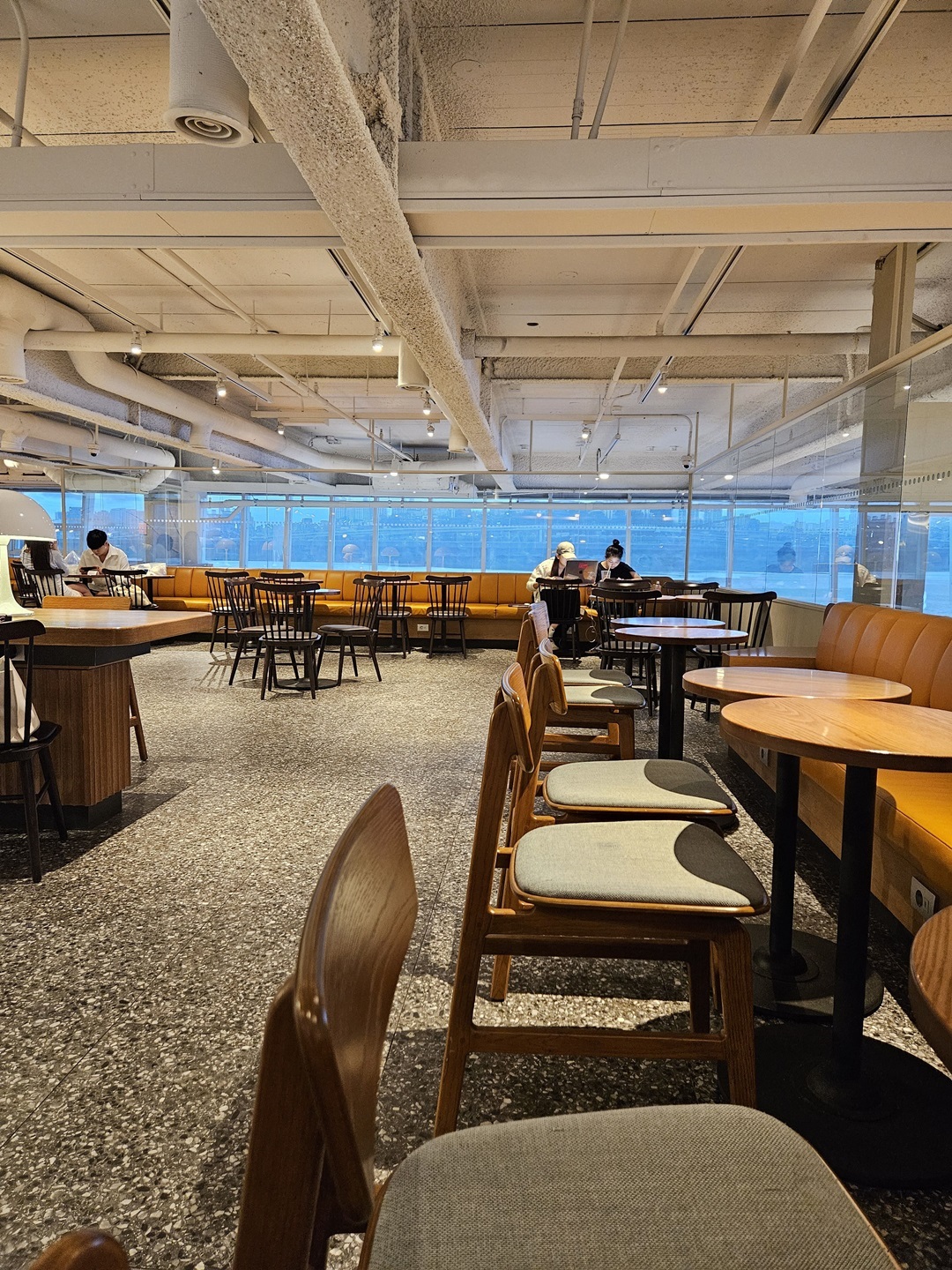 계단 올라가자마자 보이는 2층 전경입니다. 오픈 인테리어가 눈에 들어오고 창 너머로 한강물이 출렁이는 것도 보기 좋았네요~