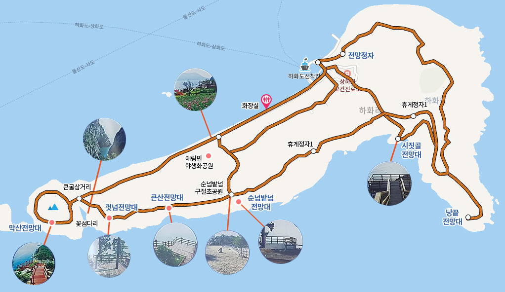 전남 여수의 하화도 꽃섬길 5.7km로 섬을 둘러보는 데 약 3시간이 소요된다고 합니다. 선착장에 내려 휴게정자를 지나고 순넘밭넘 구절초공원을 지나 큰산전망대, 깻넘전망대, 꽃섬다리, 큰굴삼거리, 막산전망대, 큰굴삼거리, 애림민야생화공원을 거쳐 다시 선착장으로 돌아오는 코스입니다.