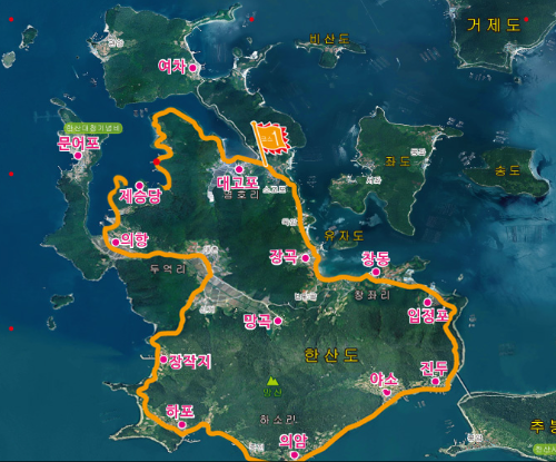통영시 남동쪽에 있는 섬으로 면적 14.8㎢의 한산면 본섬으로 작은 유무인도 중 가장 크다고 합니다. 통영시에서 뱃길로 2㎞ 떨어져 있어 접근성이 좋습니다. 통영여객선터미널에서 하루 8회씩 여객선이 드나들고 차량 운송선도 운행이 되고 있다고 하네요. 한려해상국립공원의 시발점이자 한산도대첩이 있었던 세계적인 해전의 섬으로 관광객이 끊이지 않는 섬입니다