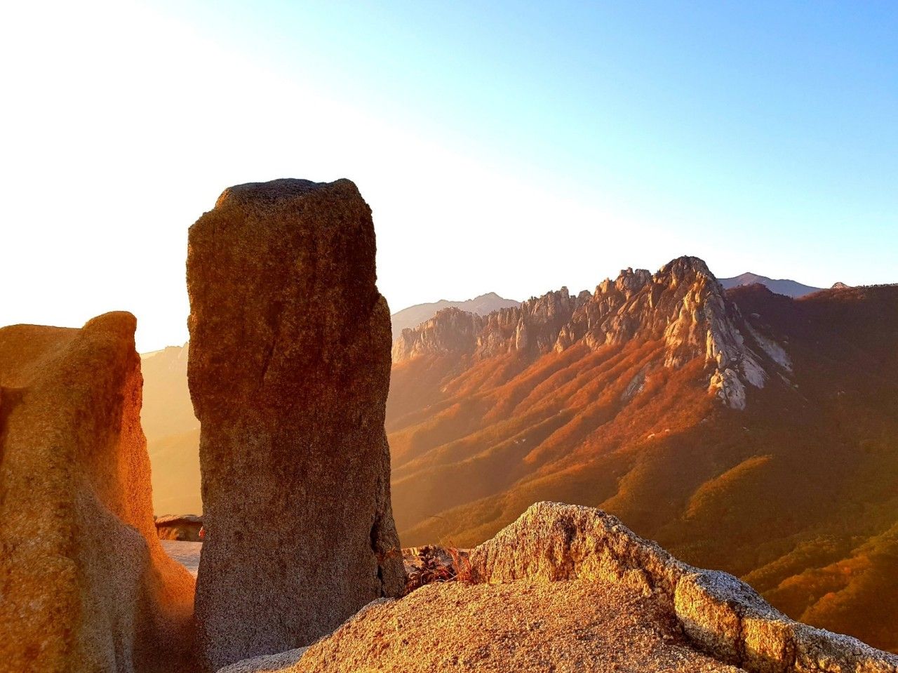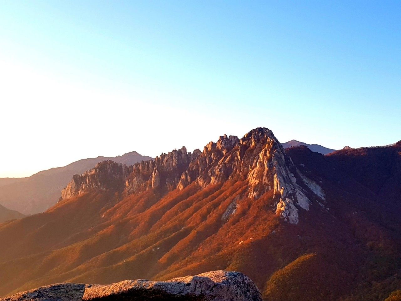 울산바위를 붉게 물들이는 모습도 장관을 이루었는데요. 울산바위 자체만으로도 감탄을 금치 못할 곳인데 붉은 해가 더해지니 더할 나위가 없었습니다.