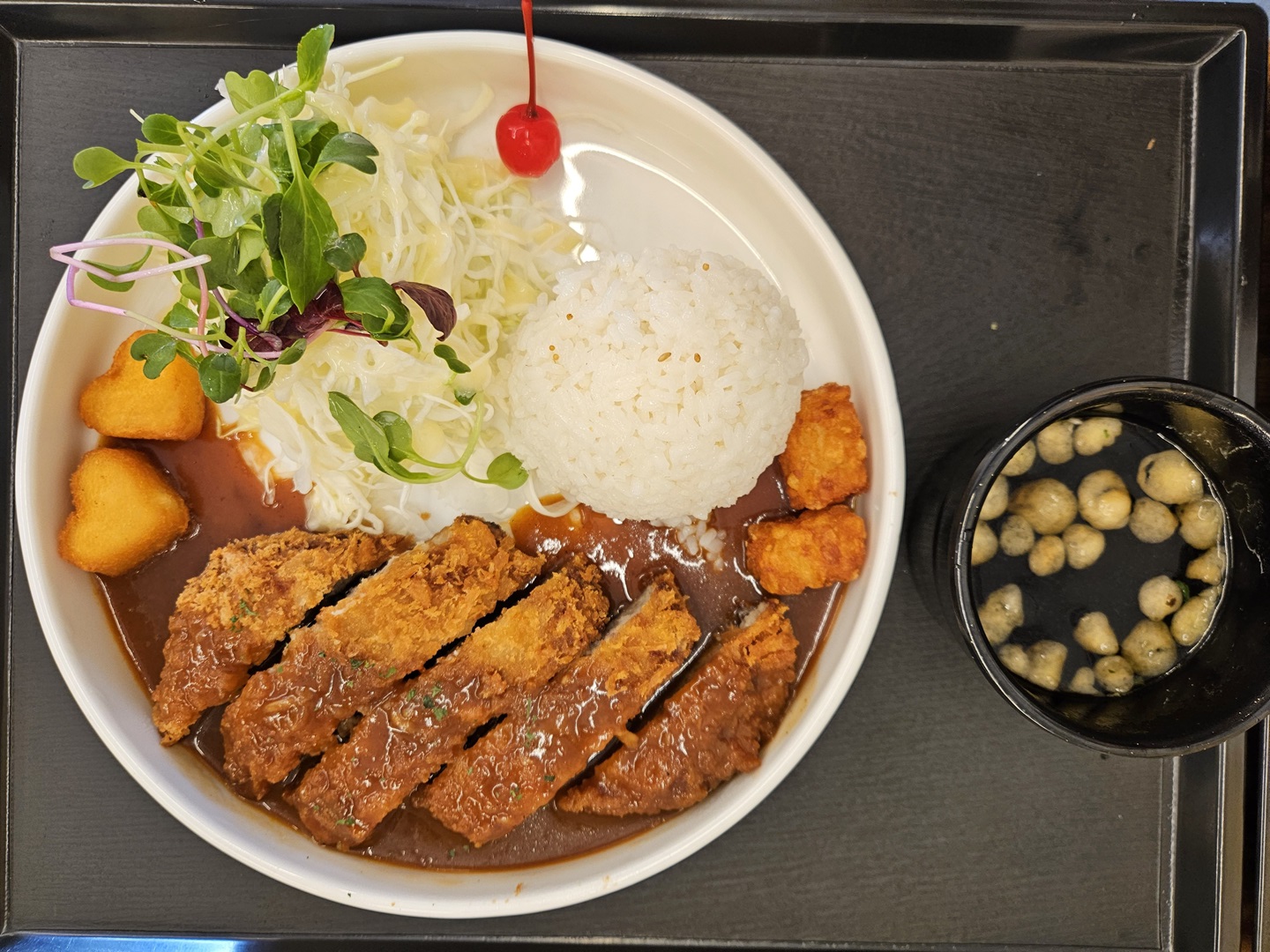 함박카츠도 정말 맛있어 보였습니다. 돈까스처럼 보이는 튀김에 소스가 부어져 나왔는데요. 소스가 짜지 않아서 더 맛있었던 것 같고 무엇보다 샐러드도 듬뿍 주셔서 더 좋았답니다. 상큼해 보이는 체리가 있어서 더 입맛이 도는 느낌이 들었다고 할까요?