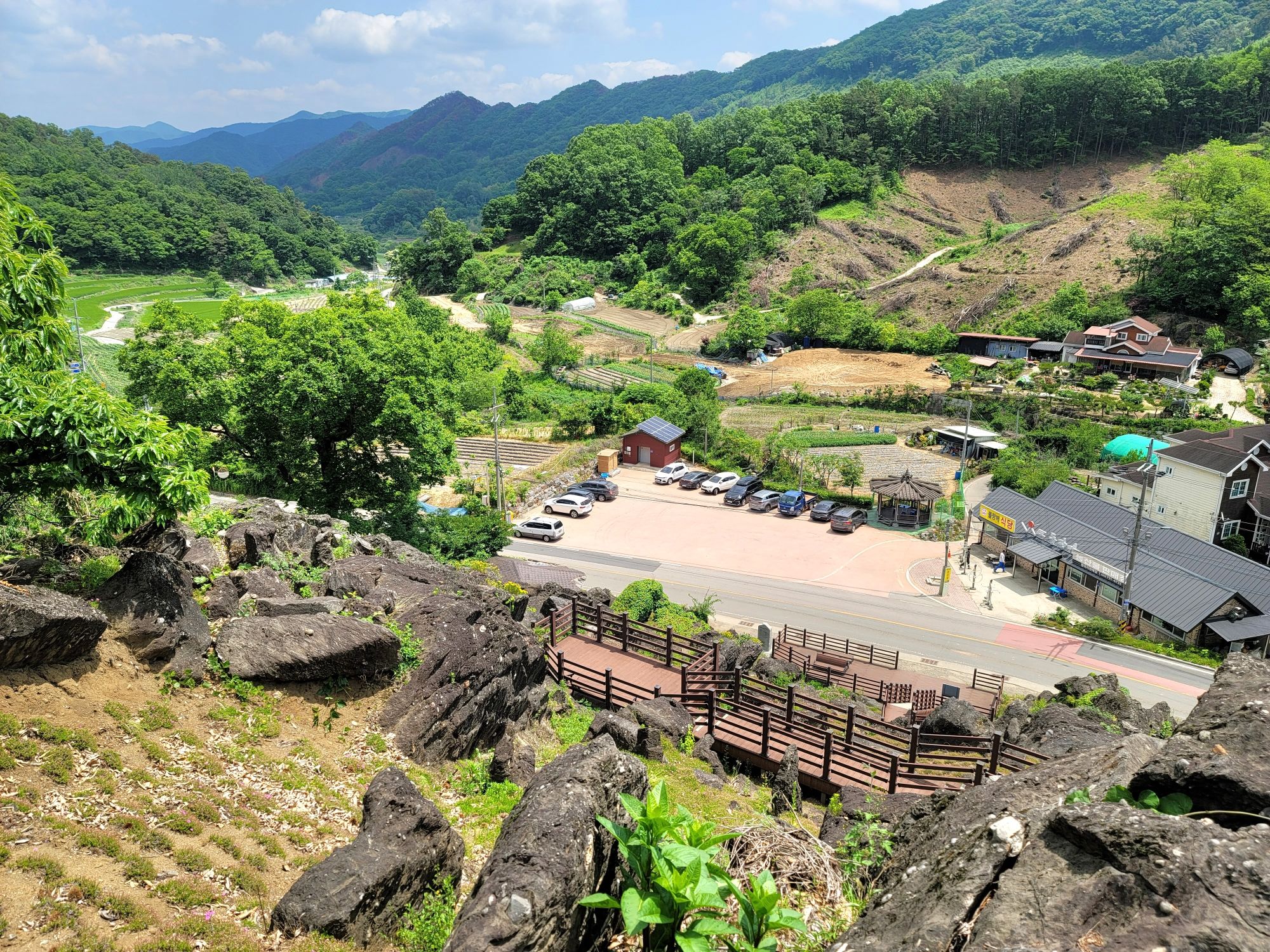 정상에서 내려다 본모습입니다. 차들이 주차되어 있는 곳이 주차장이고 좌측 구석에 작게 있는 곳이 화장실입니다. 오른쪽에는 정자도 있어 잠시 땀을 식혀 가실 수도 있고 그 옆으로 마을분들이 직접 운영하신다는 돌팡깨식당도 있습니다. 먹어보지는 않았지만 후기를 찾아보니 맛집이라는 소문이 있습니다. 점심 즈음 돌팡깨 다녀가시는 분들은 들러보세요~~