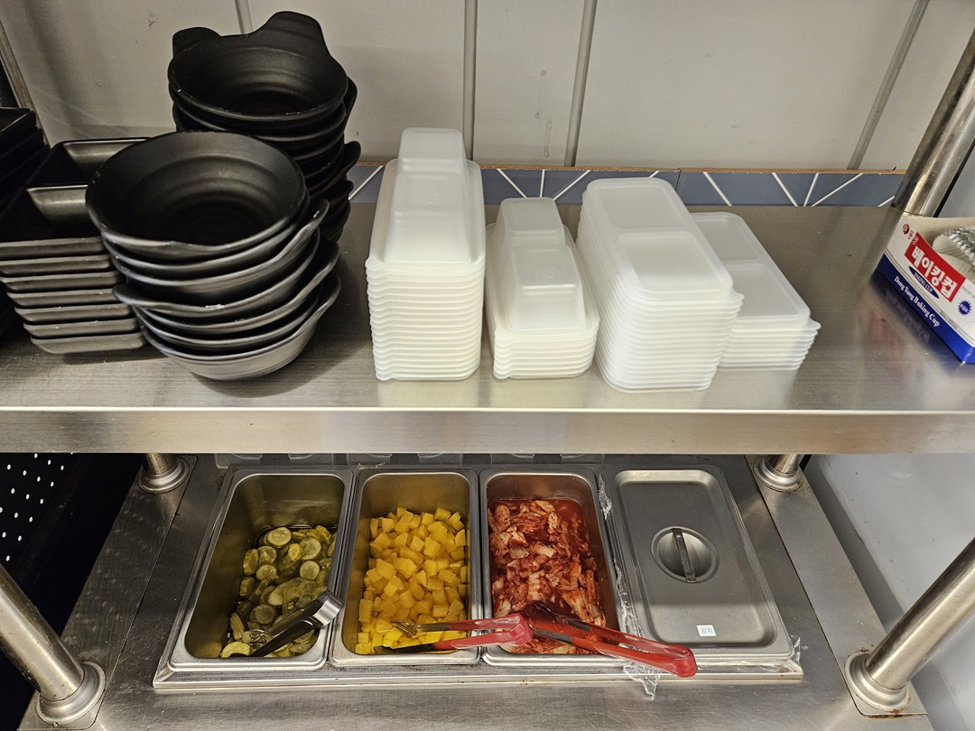 셀프바에서 사용할 수 있는 것들인데요. 앞접시와 추가 반찬 담을 그릇, 포장용기까지 준비되어 있었습니다.