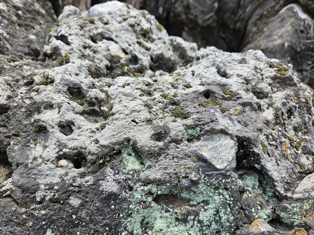 돌팡깨에 있는 바위들은 모두 똑같은 것은 없는 것 같았는데요. 바위에 박혀 있는 전혀 다른 돌들 때문인 것 같았습니다. 하얀색, 갈색.... 어떤 것은 구멍을 뚫고 넣어놓은 것 같은 것들도 있었답니다.