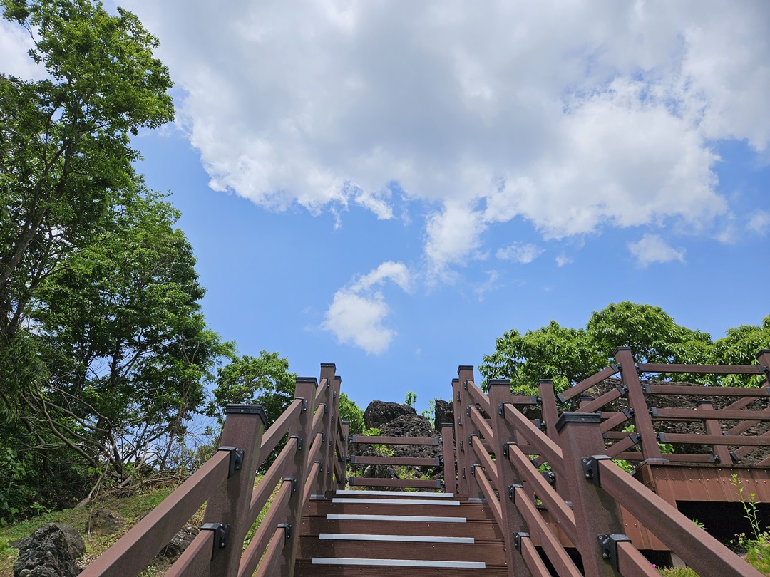 계단을 오를수록 맑은 하늘이 잘 보여 기분이 더 좋아졌습니다. 꼭대기에 있는 밤나무도 푸른 잎을 가득 안고 있으니 더 맑아 보이는 건 기분 탓이겠죠?
