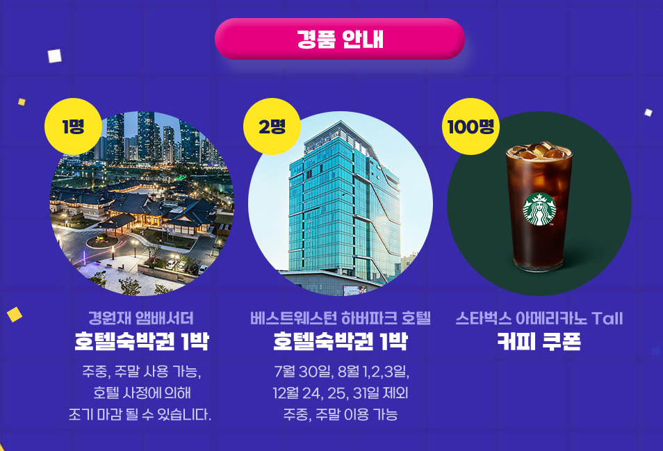 인천의 멋진 야경 명소 두 곳 투표하고 호텔숙박권과 커피음료를 받을 수 있는 이벤트가 5월 10일(수)~5월 23일(화)까지 있습니다. 그리고 이벤트 내용을 친구들에게 소문내고 인천투어패스 경품을 받을 수 있는 기회도 있습니다.
