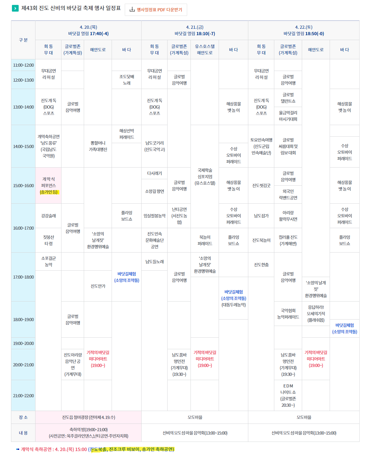 3일간 정말 다양한 행사가 계획되어 있습니다. 그중 진도의 딸인 송가인 가수의 무대가 개막식(4월 20일)에서 있을 예정이니 놓치지 말고 꼭! 참석하시기 추천합니다.