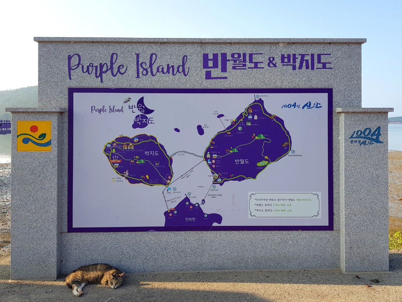 반월도+박지도=퍼플섬에 도착했습니다. 야옹이가 시원한 곳을 찾아 누운 것 같은데 반만 걸쳤네요~^^