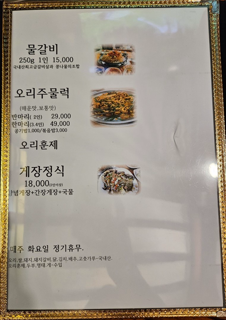 주요 메뉴 : 물갈비 1인(250g) 15,000원, 오리주물럭 2인(반마리) 29,000원, 게장정식 18,000원 등 한식류