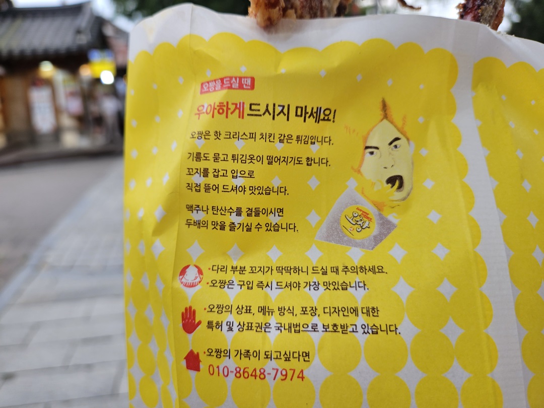 오짱 획득!! 1마리를 통째로 튀겨서 치즈, 어니언, 칠리 세 가지 맛 중에 하나를 고를 수 있어 치즈로 선택!! 1마리에 두 개의 꼬지가 꽂혀있어 반으로 나눈 다음 담아주셨는데요. 먹기 편리했네요~ 한 마리 12,000원이었습니다.
