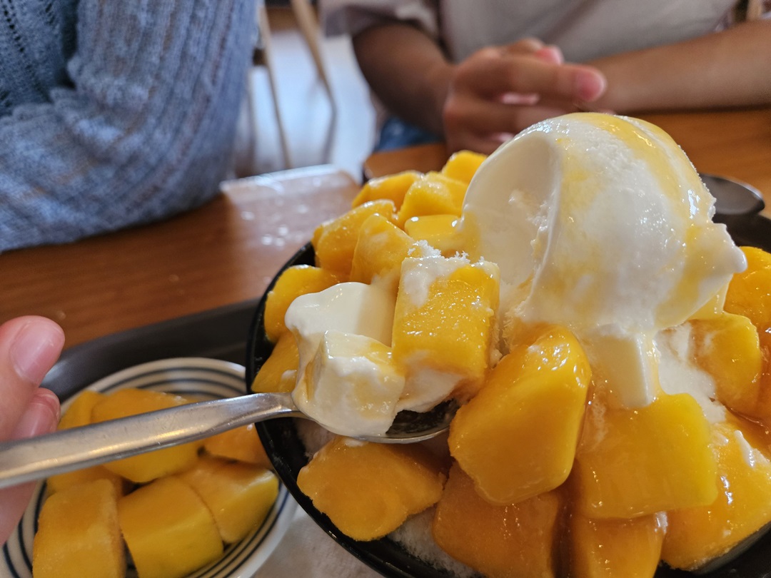 빙수위에 아이스크림과 네모난 치즈도 있어 한입에 넣으면 시원하고 치즈향이 아주 진하게 나서 맛있었답니다.