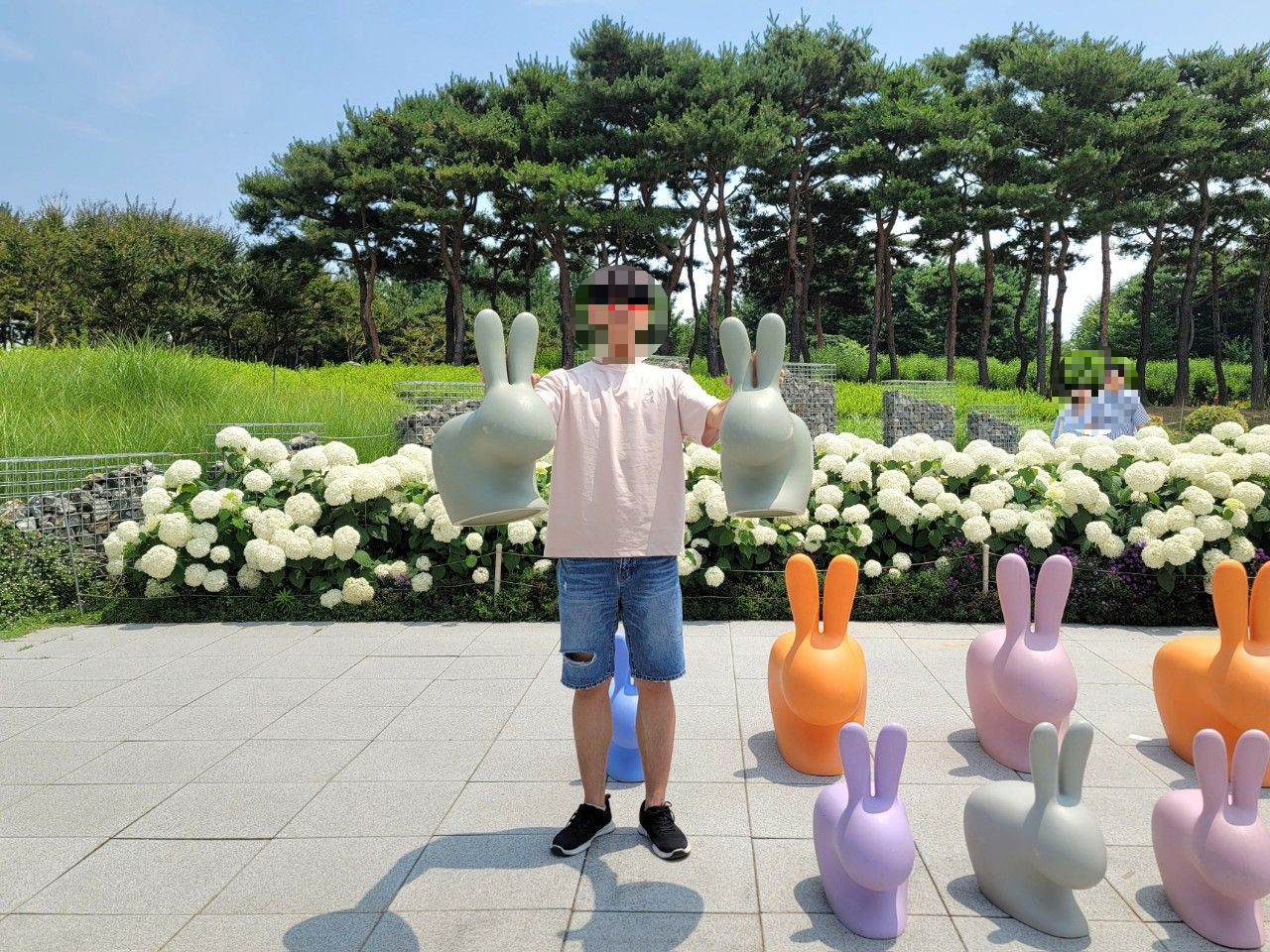 수국 앞쪽에 작은 토끼 의자들이 많이 있어서 앉아도 보고 두 마리 토끼도 잡은 둘째 꼬맹이~~