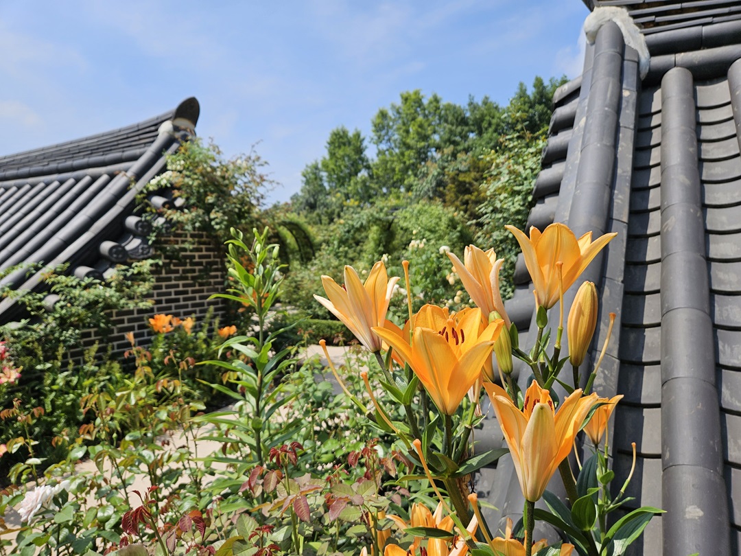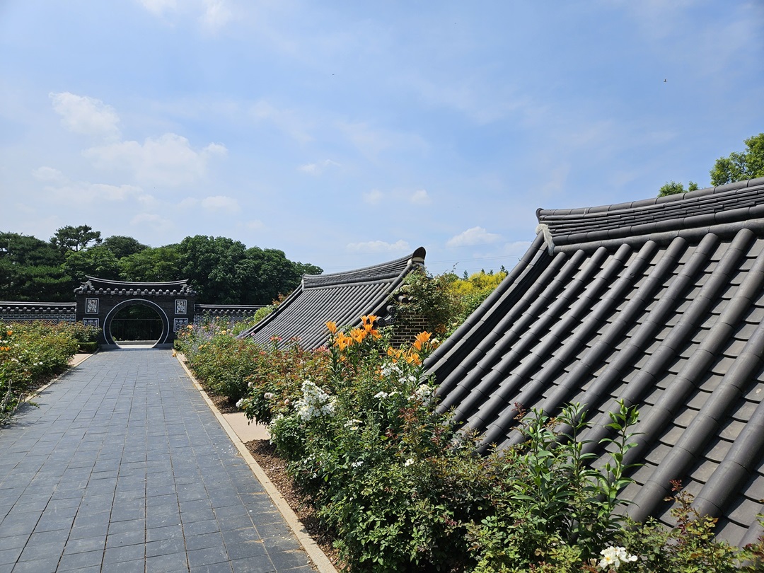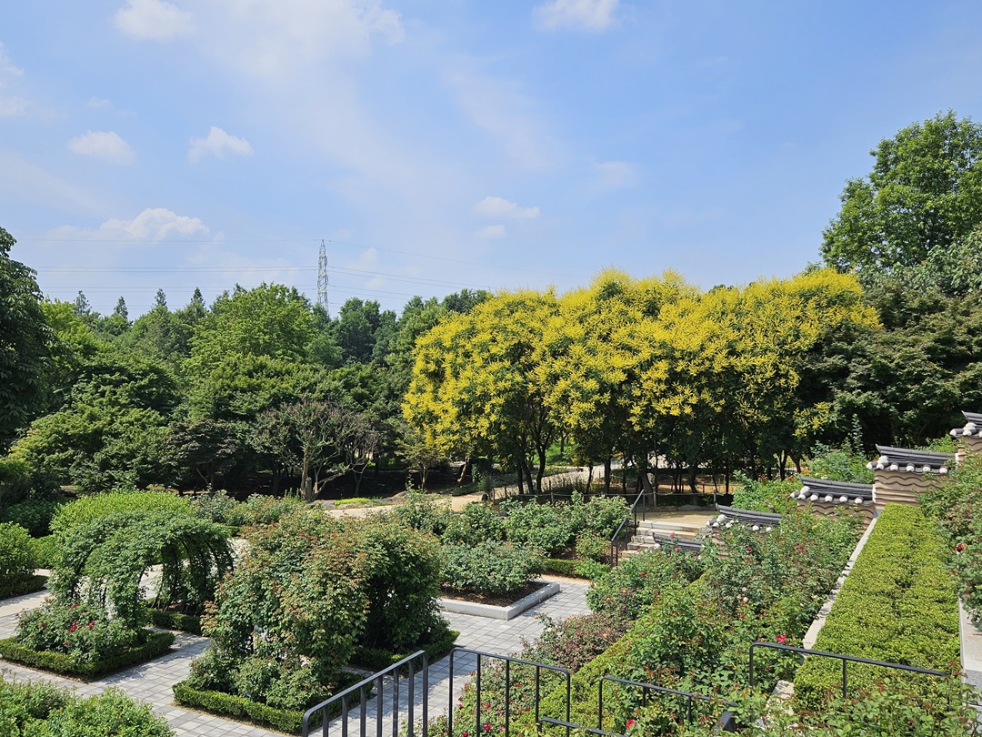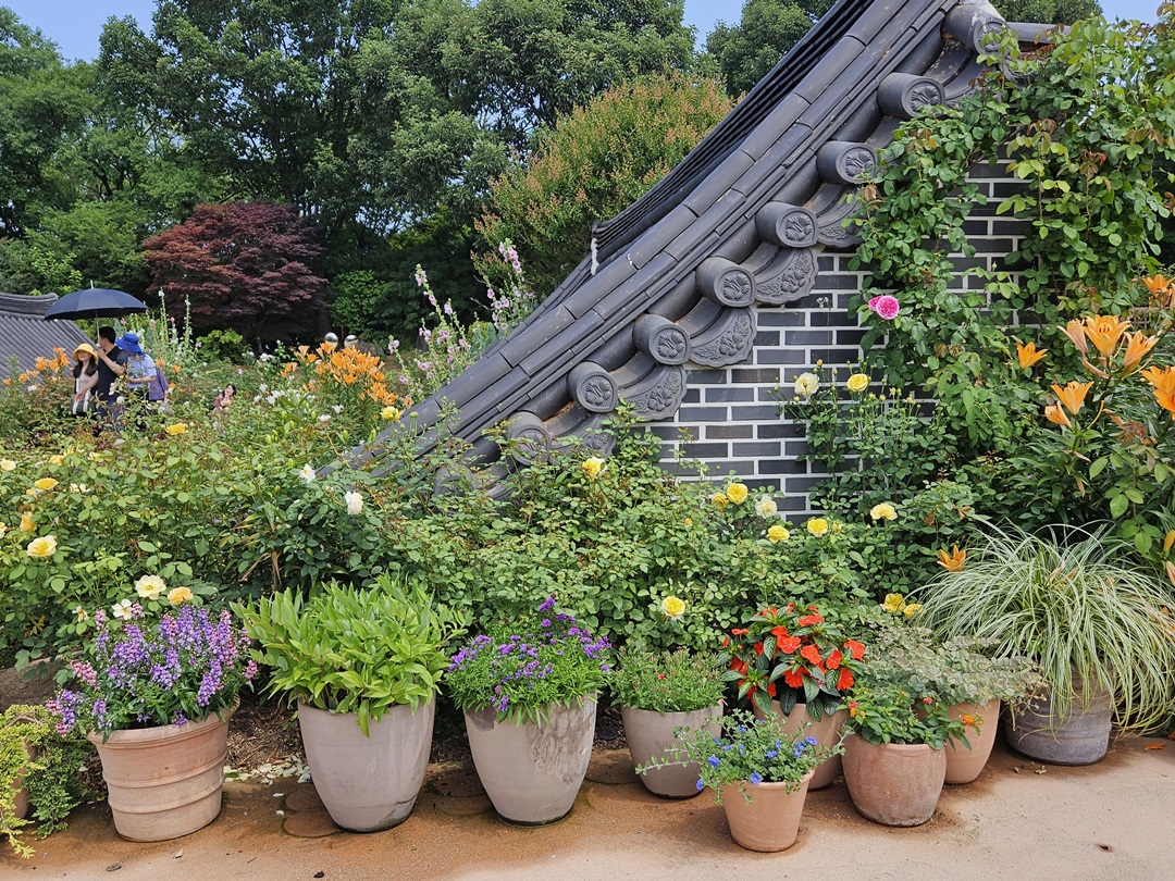 폭포 지나 바로 장미원에 도착할 수 있는데요. '장미의 뜨락'이라고도 하는 이곳은 특이한 기와지붕과 장미, 여러 가지 꽃들로 가득한 곳이었습니다.