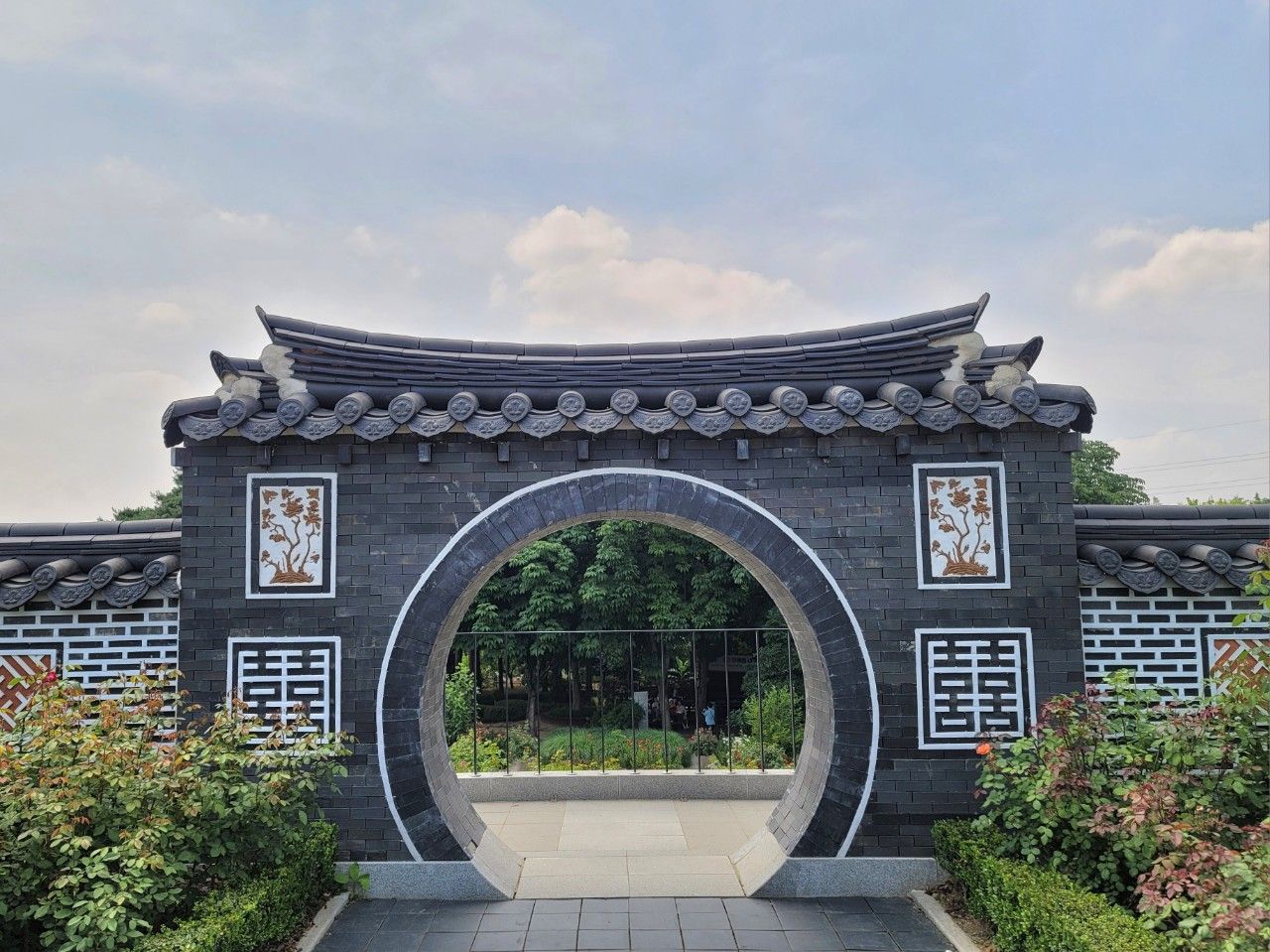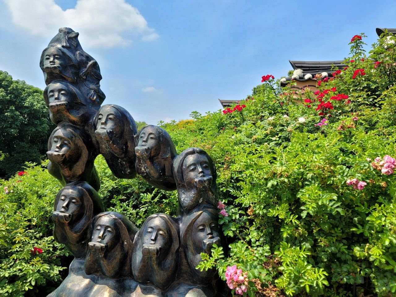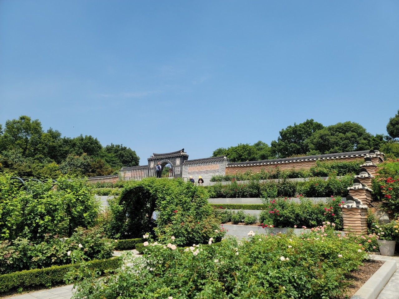 폭포 지나 바로 장미원에 도착할 수 있는데요. '장미의 뜨락'이라고도 하는 이곳은 특이한 기와지붕과 장미, 여러 가지 꽃들로 가득한 곳이었습니다.