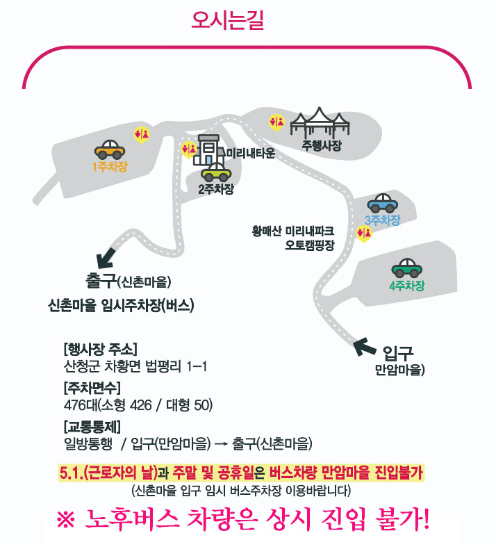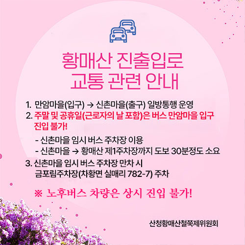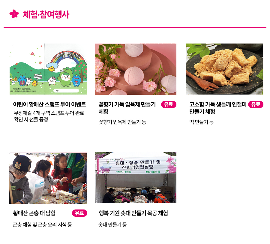 다양한 볼거리와 체험거리 가득한 산청 황매산에서 있을 철쭉제 축제에 많이 참여하셔서 봄꽃 철쭉 만끽하시고 행복한 추억도 많이 만들어 가시길 바랍니다.