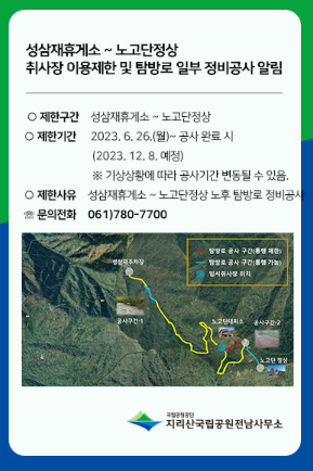 지리산국립공원 홈페이지 방문해 보니 성삼재휴게소에서 노고단 정상까지 취사장 이용제한 및 탐방로 일부 정비공사가 있어 제한된다는 공고가 있네요. 지리산 등산 계획하시는 분들 참고하시기 바랍니다.