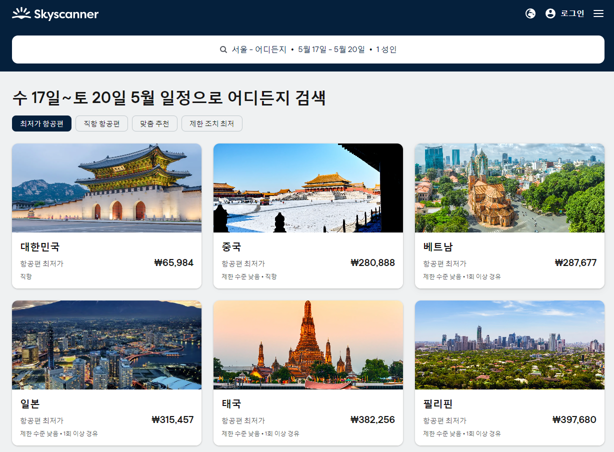 스카이스캐너 홈페이지 방문 시 간단하게 최저가 항공권을 검색하실 수 있습니다.