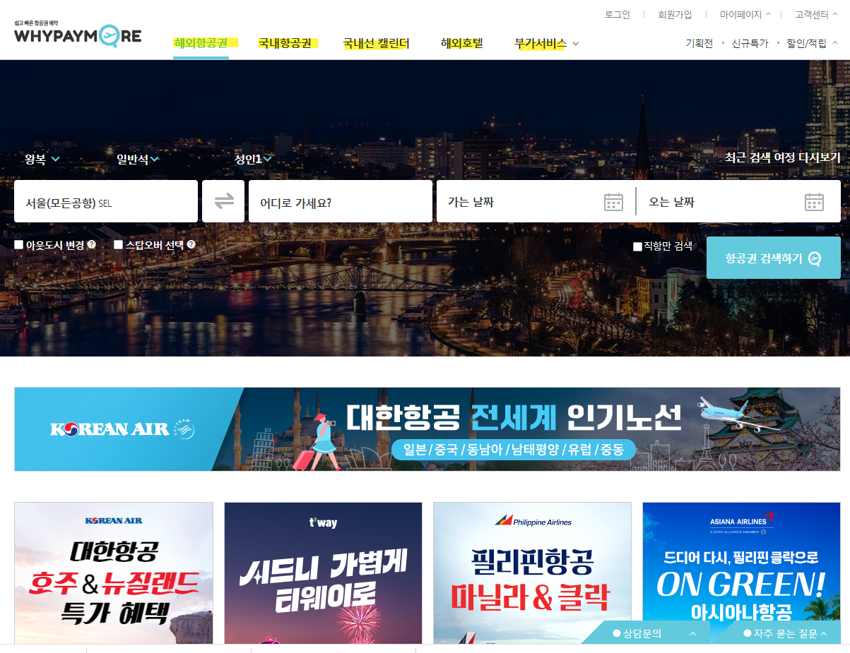 와이페이모어 홈페이지를 방문하시면 아래와 같은 다양한 카테고리에서 여행과 관련된 서비스를 제공받으실 수 있습니다.