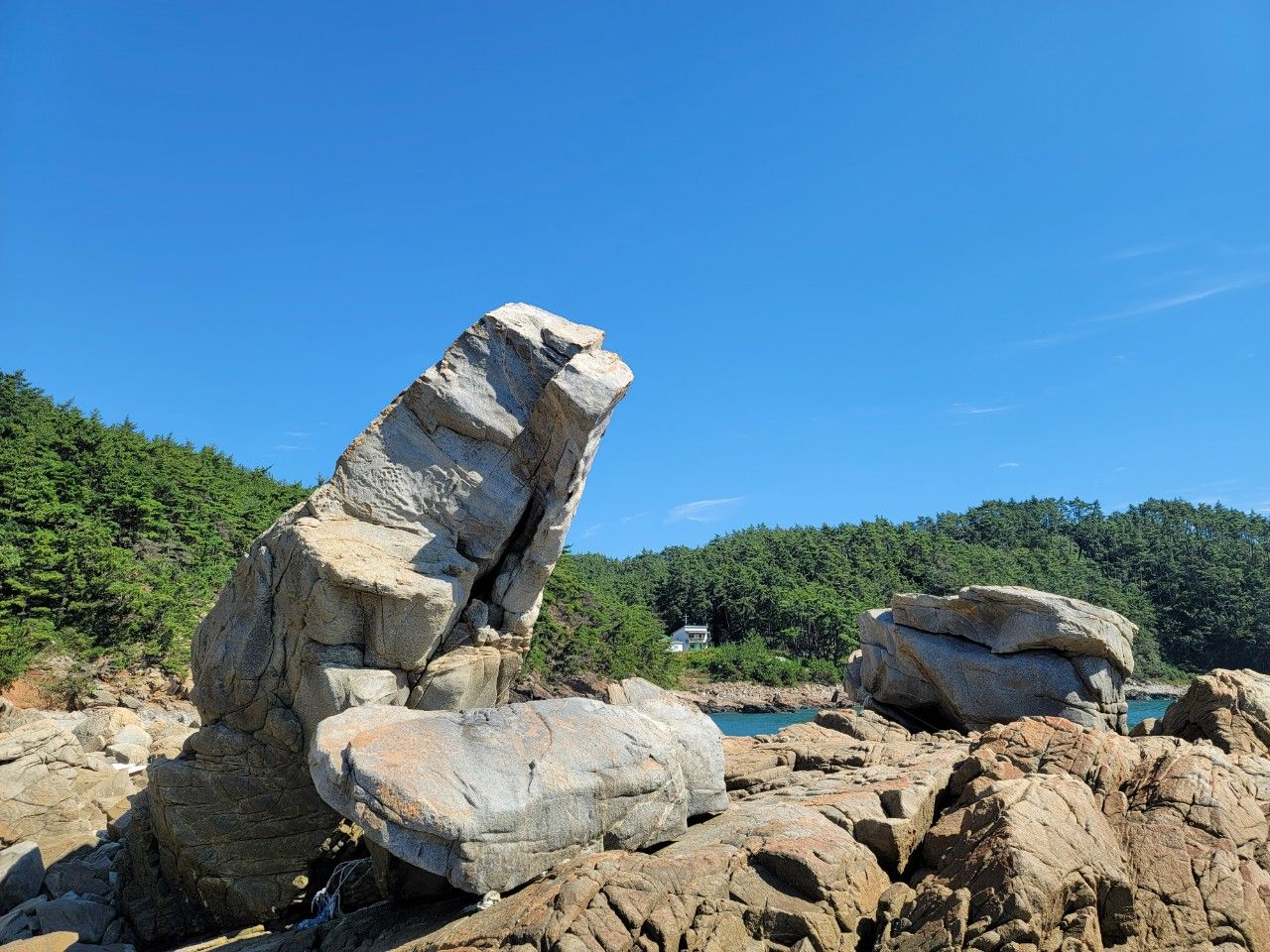 석화가 다닥다닥 붙어 있는 갯바위가 있는 곳으로 깔끔한 모래해변이 있는 만대항이라고 합니다.
