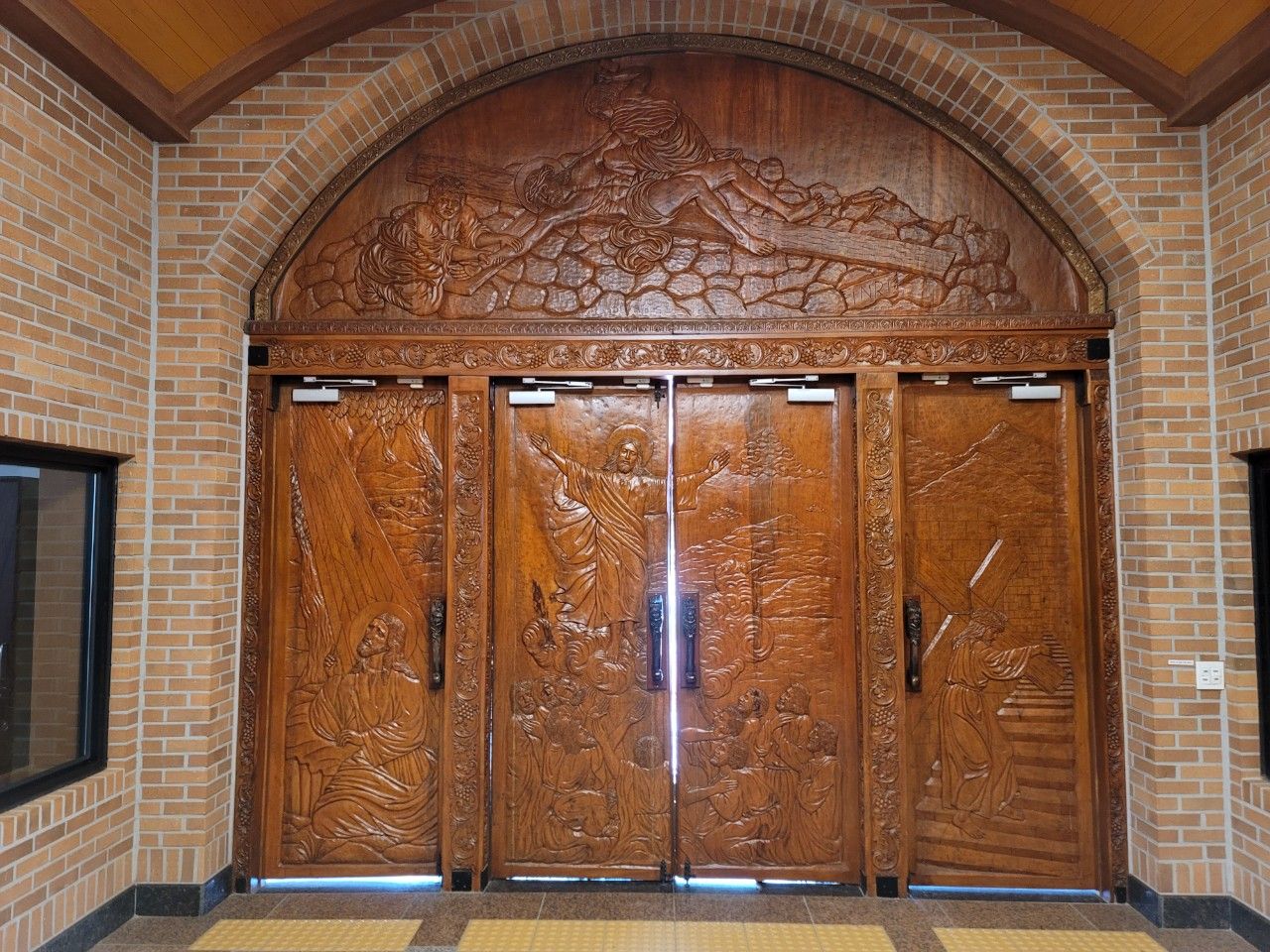 출입문에 조각된 예수님, 십자가... 잘은 모르겠지만 예술작품을 보는 느낌이었습니다. 성당 내부도 들어가 보고 싶었지만 미사가 진행되고 있어서 들어가지는 않았습니다.