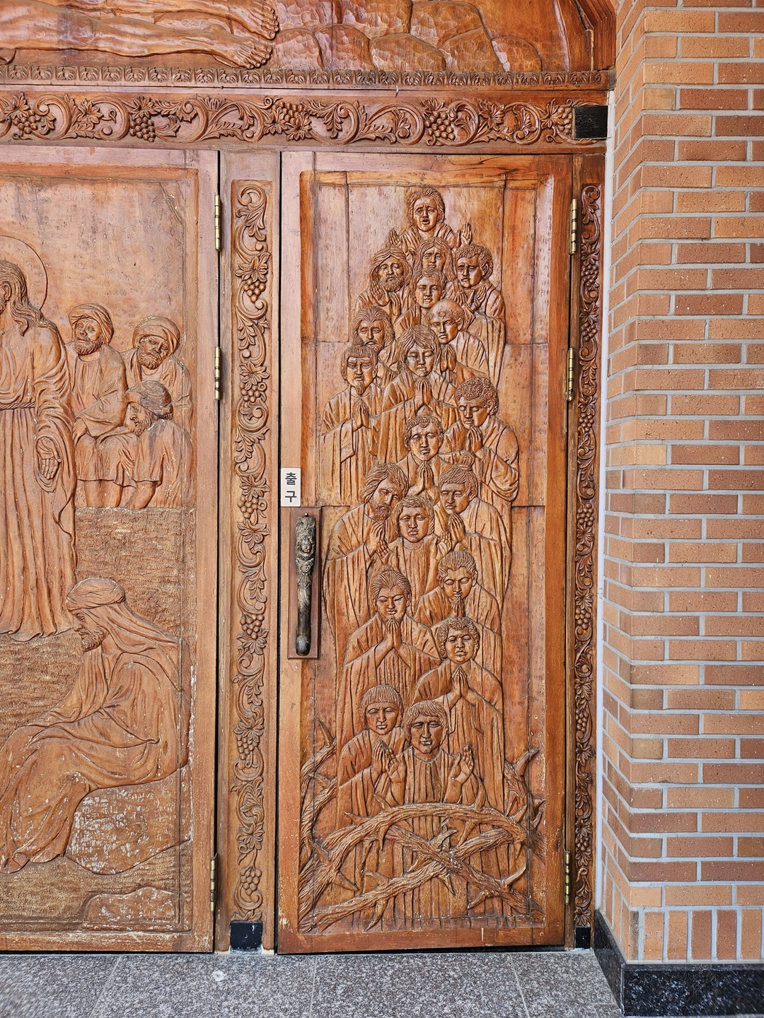 출구의 모습인데요. 박해로 순교하신 분들을 조각한 것이 아닌가 하는 생각이 드는 문이었습니다.