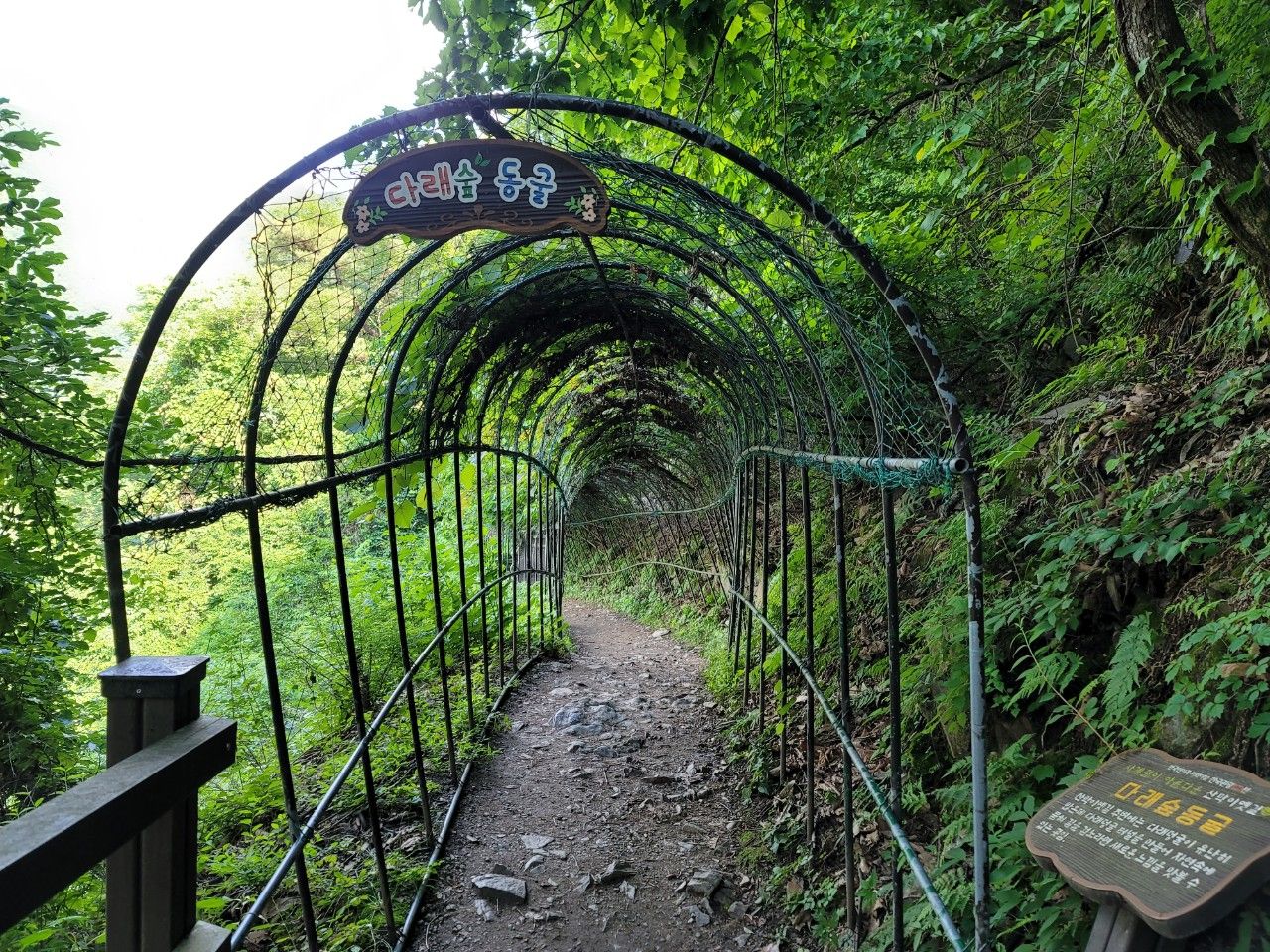 다래숲 동굴입니다. 지금은 잎만 나고 있지만 가을이면 다래가 달리고 주렁주렁 매달려 있을 것 같은데요. 어렸을 때 먹어봤던 다래맛을 생각하며 건너보았습니다.