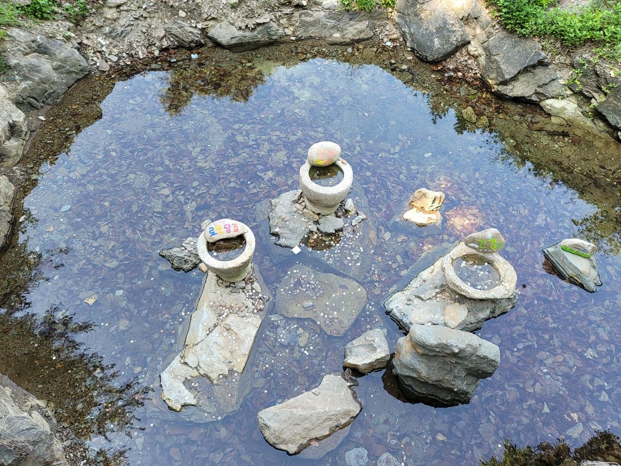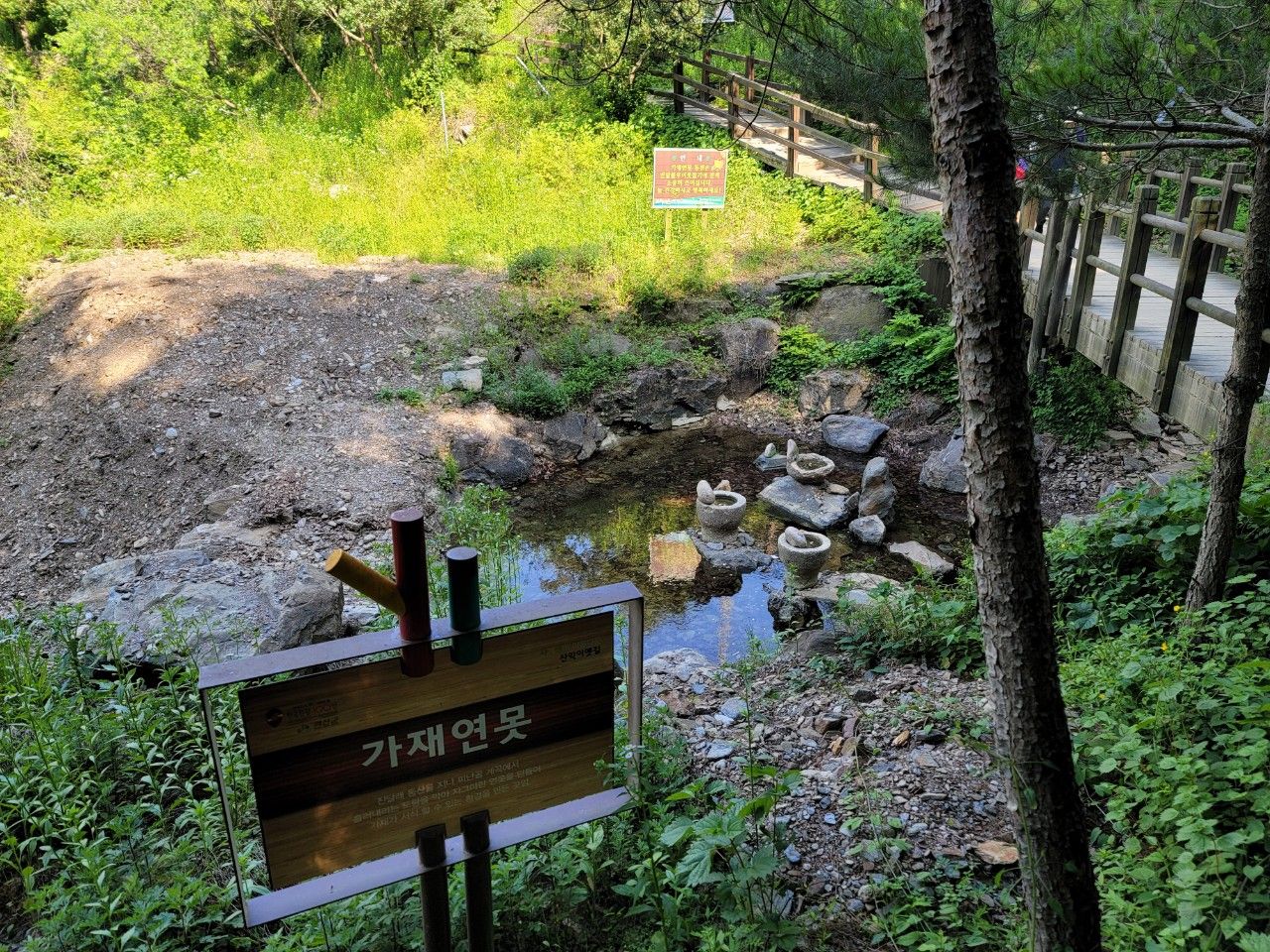 가재연못입니다. 물이 맑아서 가재가 잡힐 것 같았고요~연못 중간에 있는 절구모양의 돌들이 눈에 띄었습니다.