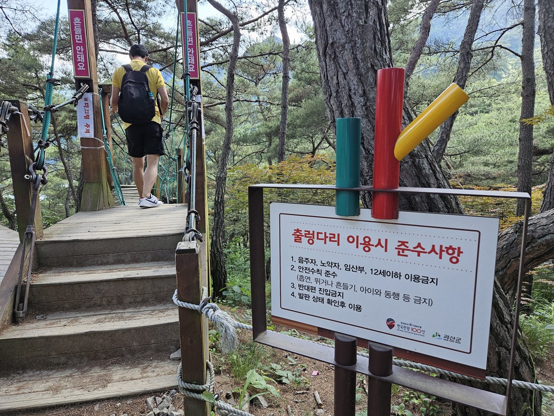 출렁다리 이용 시 준수사항 잘 읽어보고 안전하게 건넜습니다. 준수사항에 있는 것처럼 어린아이들은 이용을 자제하는 것이 좋을 것 같았습니다. 그리고 절대 흔들면 위험하니 최대한 천천히 건너보았네요~