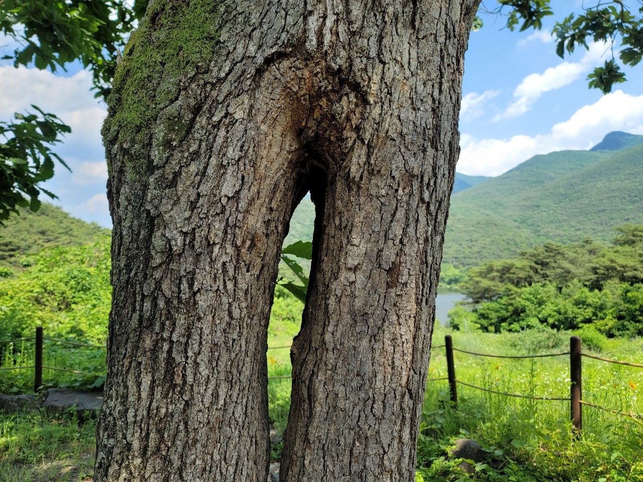 바로 뒤에 연리지 갈참나무가 있었는데요. 보는 각도에 따라 느낌이 다르답니다. 입구에 이 연리지 나무를 100번 찾고 소망하면 원하는 사랑이 이루어진다고 하는 푯말이 있답니다. 100번은 좀 많은 듯~~