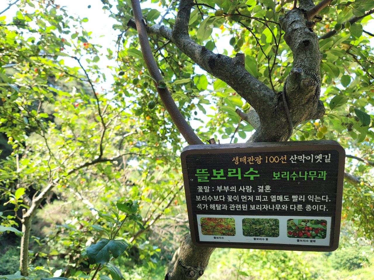 바로 뒤에 연리지 갈참나무가 있었는데요. 보는 각도에 따라 느낌이 다르답니다. 입구에 이 연리지 나무를 100번 찾고 소망하면 원하는 사랑이 이루어진다고 하는 푯말이 있답니다. 100번은 좀 많은 듯~~