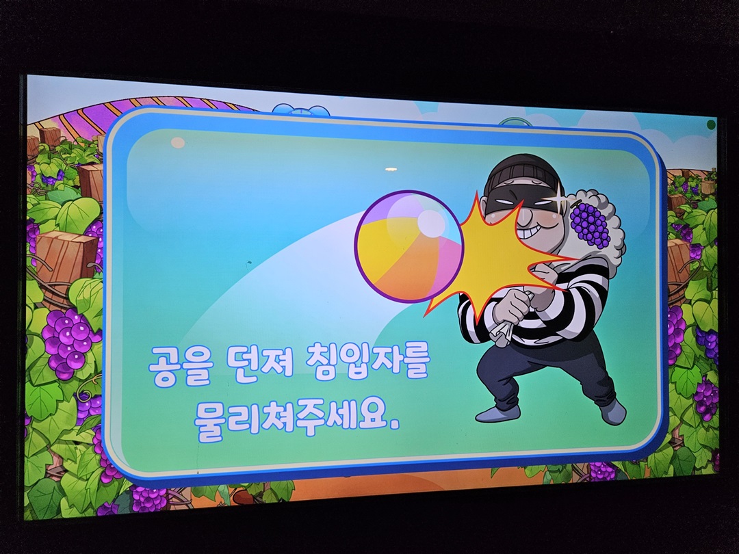 화면에 포도 도둑이 나오면 앞에 있는 소프트볼을 던져 맞추면 되는 게임입니다. Let's start!!