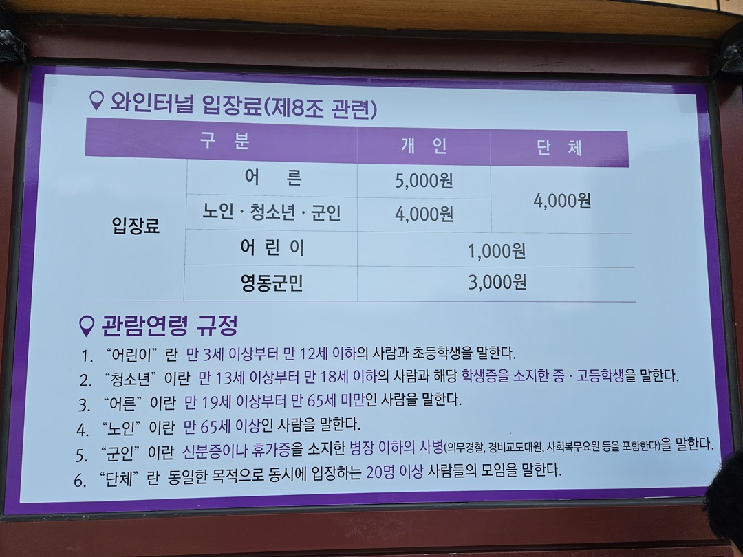 이용요금 : 성인 5,000원, 청소년/군인/노인 4,000원, 어린이 1,000원, 영동군민 3,000원(유료 관광객 1인당 2,000원권 영동사랑상품권 지급, 어린이는 제외)